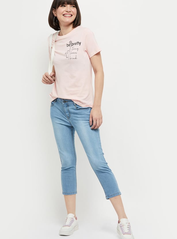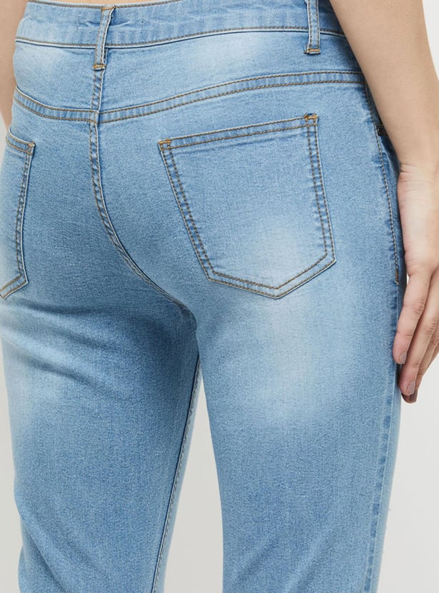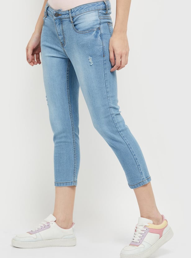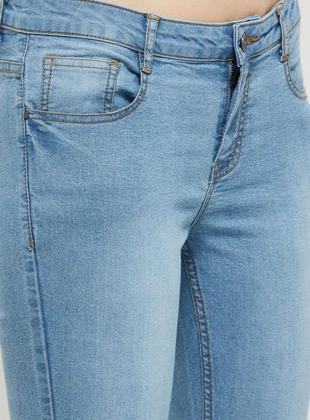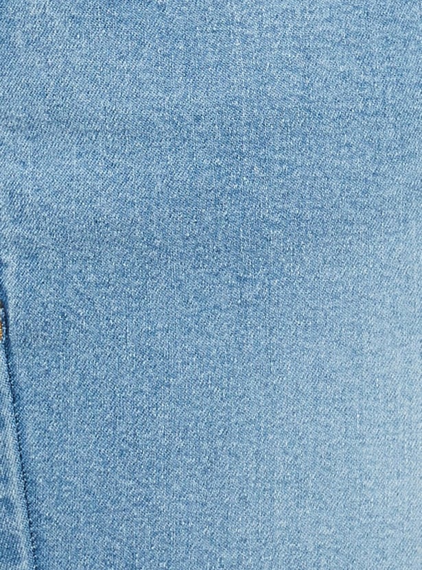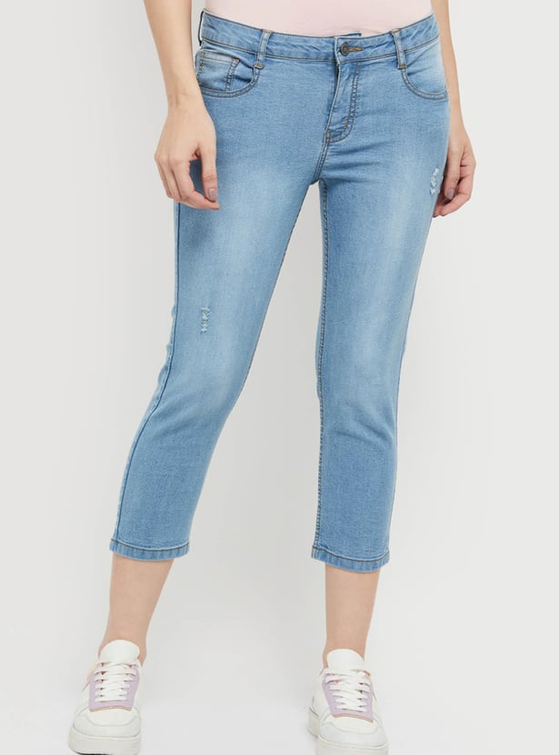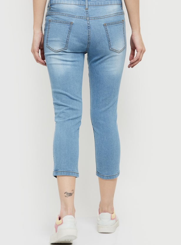 Designed with a stonewashed effect, this denim capris is complemented with button closure, insert and patch pockets.