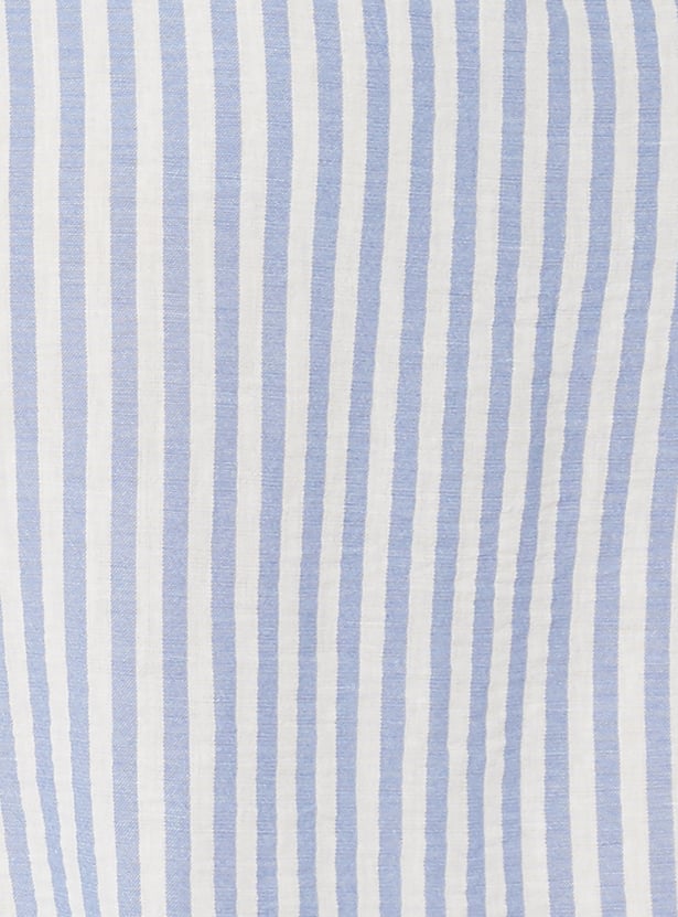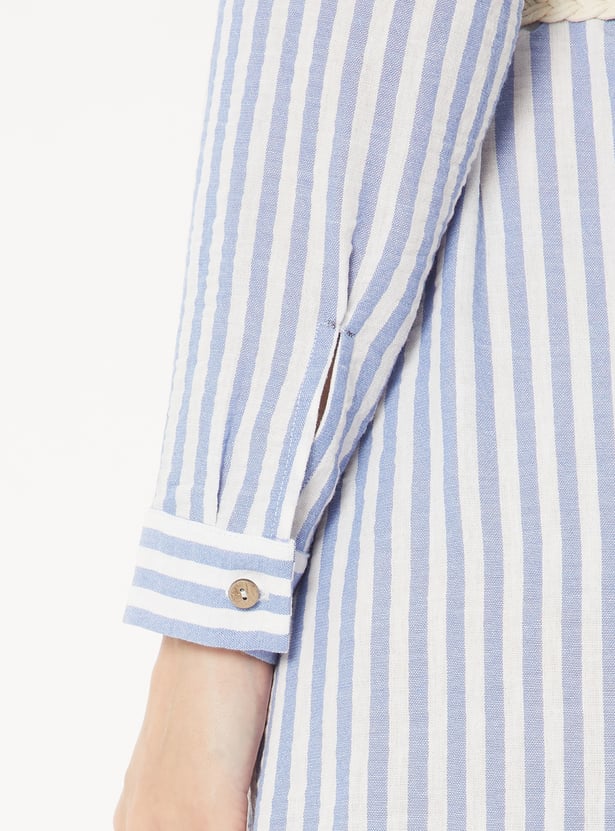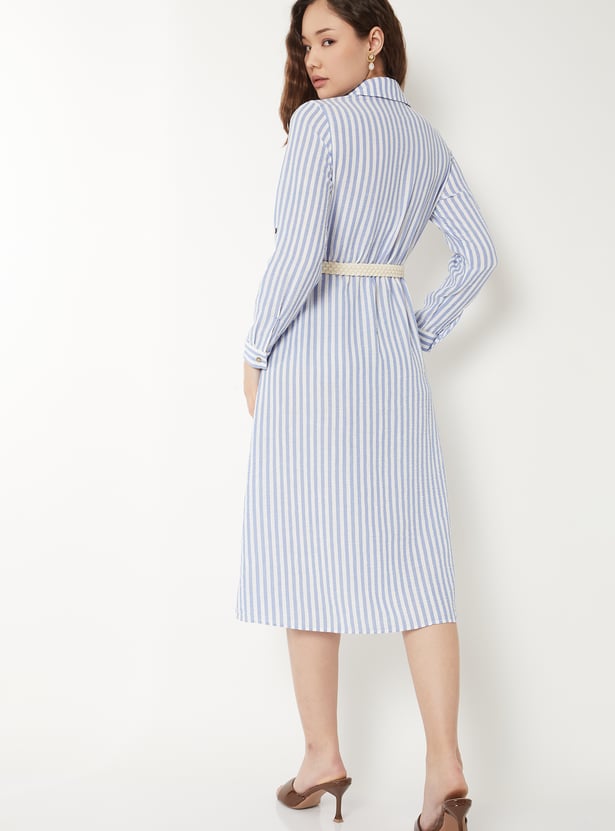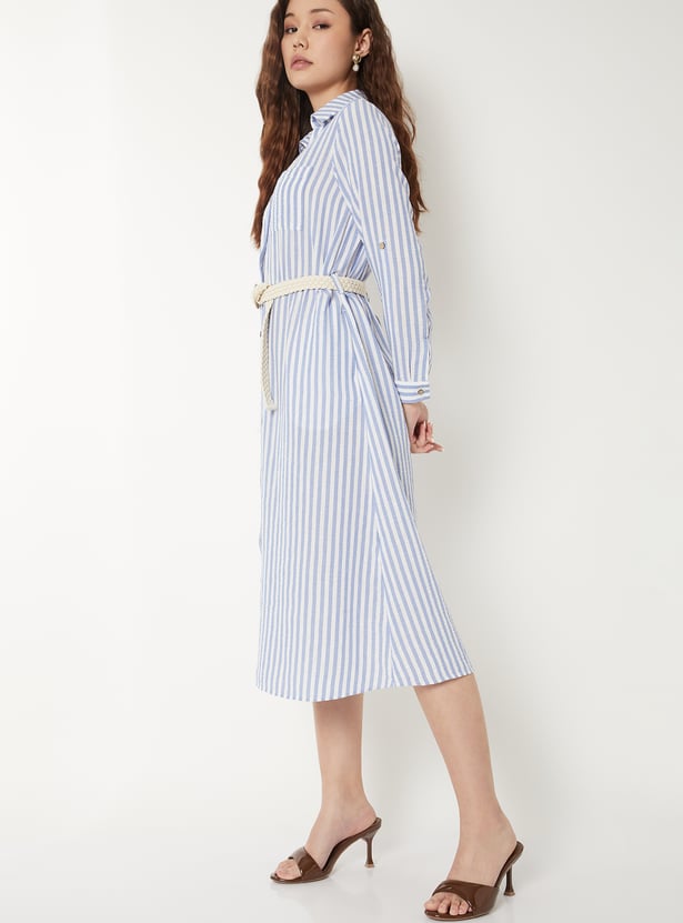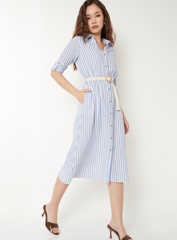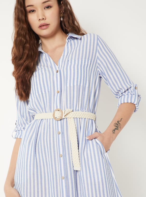 This striped A-line shirt dress combines a crisp button-down front, full sleeves with roll-up tabs, and a matching belt for a polished yet effortless silhouette. The clean stripes and structured design make it a versatile go-to for workdays, brunches, and beyond.