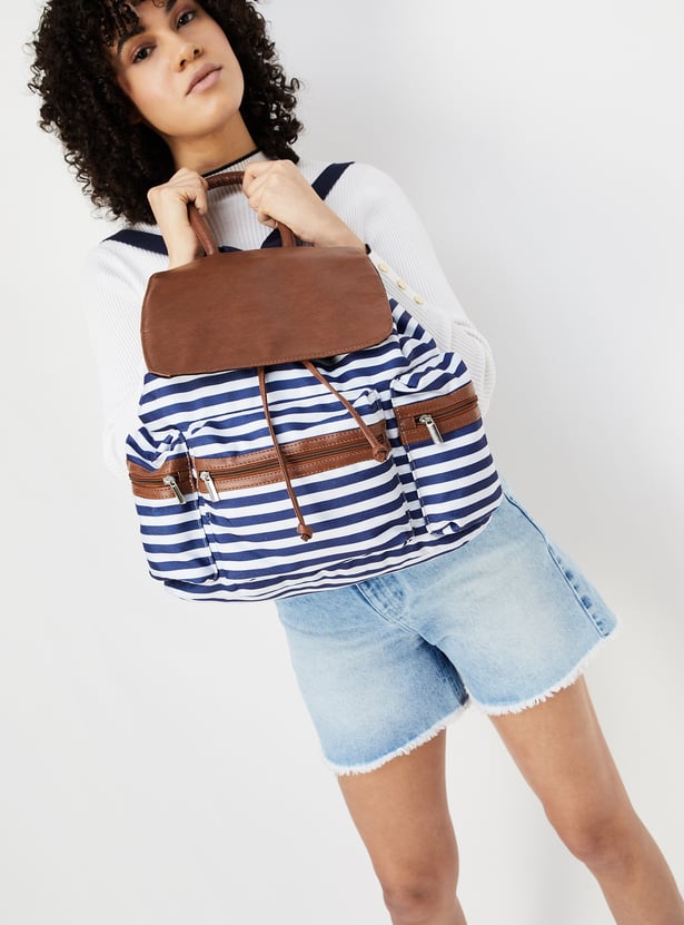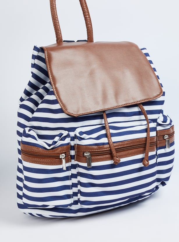 A stylish add-on for your everyday looks, a backpack with trendy stripes, and a modern look. It is finished with a drawstring closure, spacious compartment, zip pocket, shoulder straps, and a carry handle at the top.