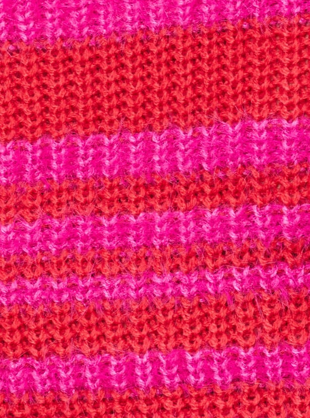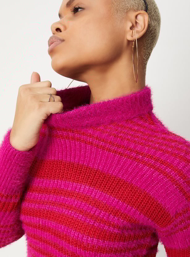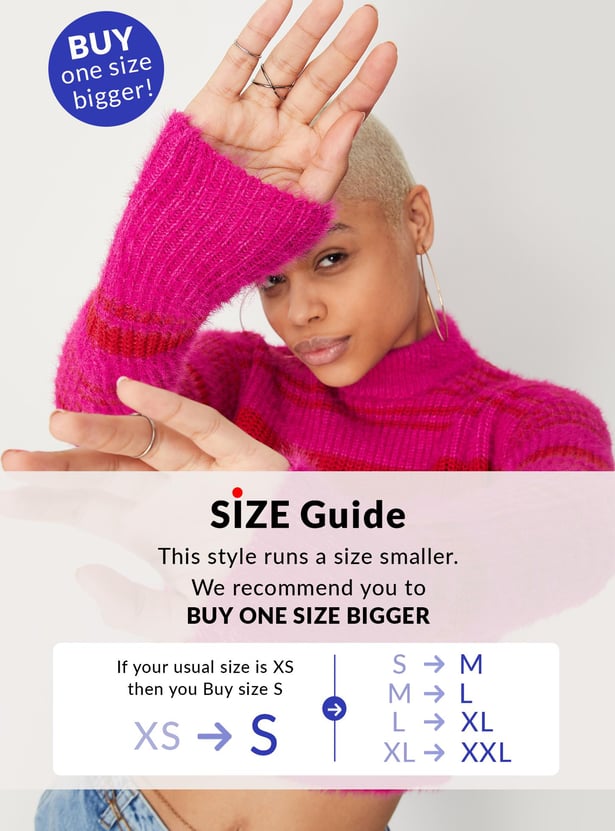 Beat the winter blues in this sweater which is crafted in a cropped length with a striped pattern. It is styled with a mock neckline, drop shoulders, long sleeves, and ribbed trim.