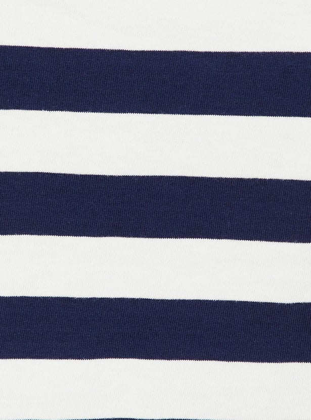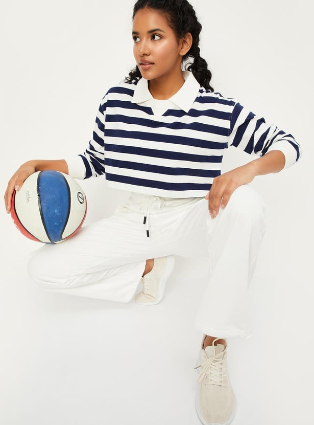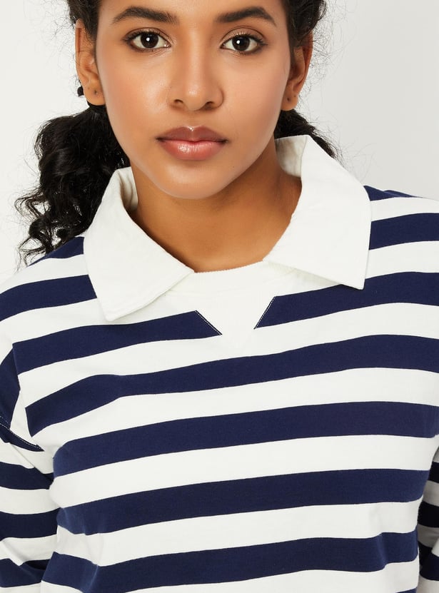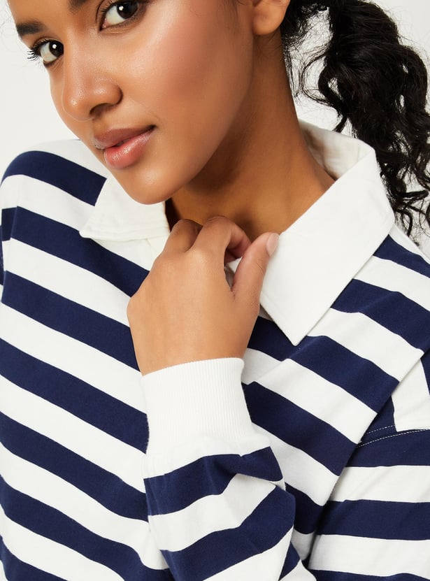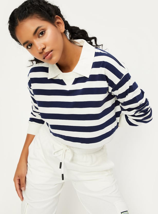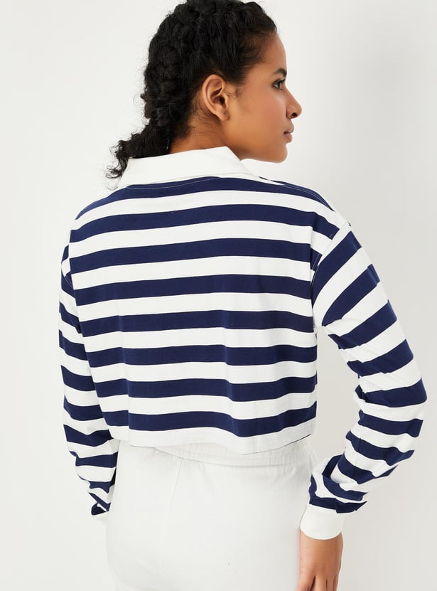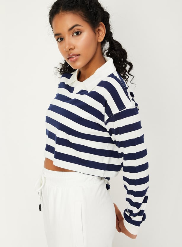 Women Striped Full Sleeves Polo Crop Top