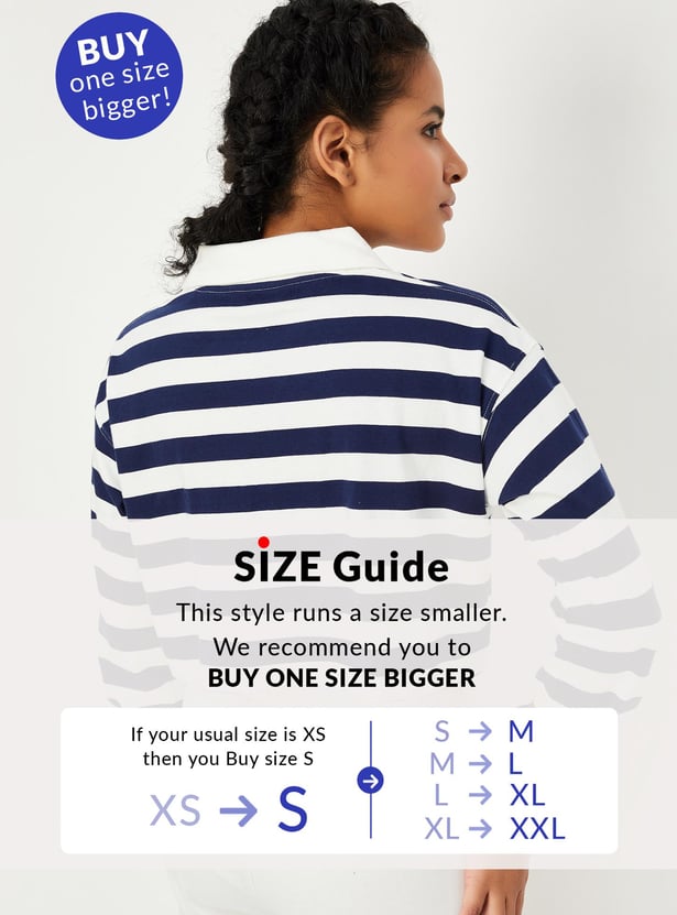 Look effortlessly stylish in this striped polo crop top featuring a polo collar, full sleeves, and a cropped hemline. The top features a playful combination of stripes that add a dynamic flair to the classic polo style. It is perfect for casual outings.
