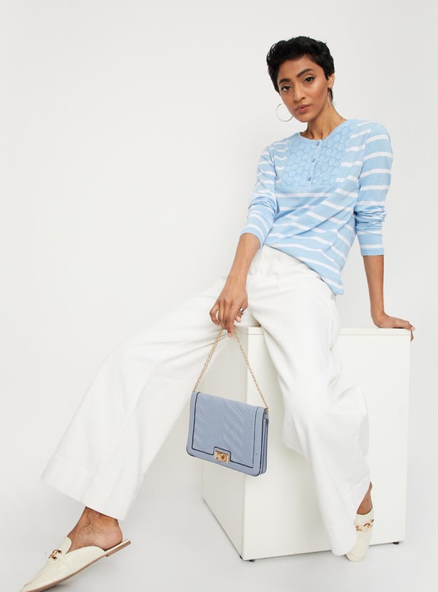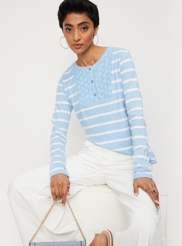 Add a chic twist to your casual look with this T-shirt. It features a striped pattern, schiffli embroidered yoke, Henley neck, and long sleeves. A pair of jeans and sandals with this tee will take your style up a notch.