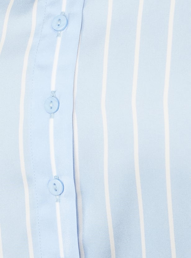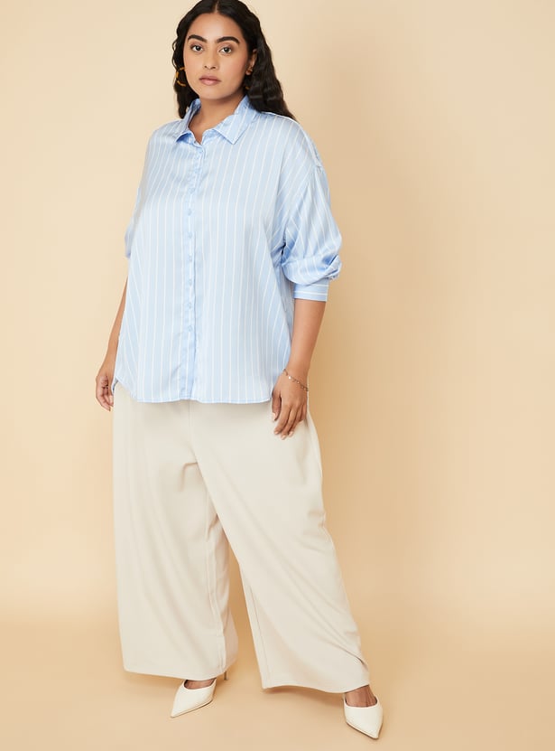 Effortlessly stylish, this striped oversized shirt combines a relaxed silhouette with classic detailing. It features a spread collar, a neat button placket, and full sleeves with button cuffs, making it a versatile choice for any occasion. Model Size :