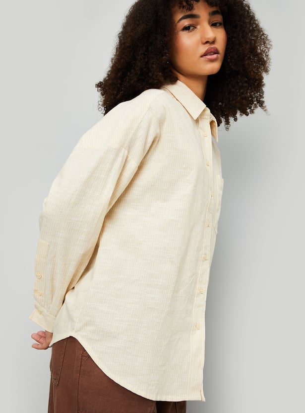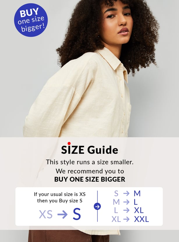 This striped oversized shirt features a classic spread collar, button placket, and full sleeves with button cuffs for a stylish, relaxed fit. The stripes add a timeless touch, making it a versatile wardrobe staple.