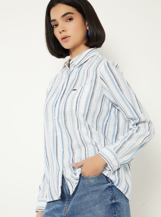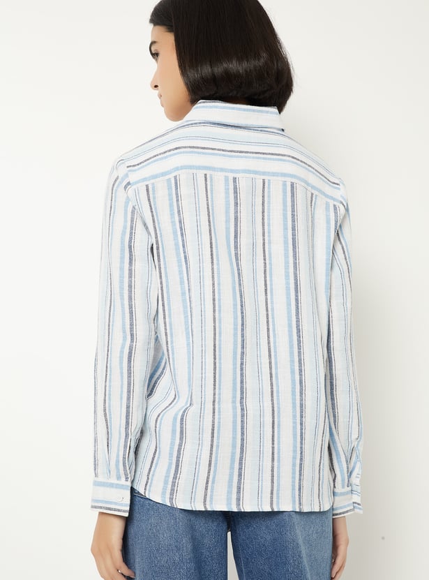 Make a smart impression with this striped shirt, tailored for everyday versatility. It features a spread collar, button placket, and a patch pocket, finished with full sleeves and button cuffs for a polished touch.