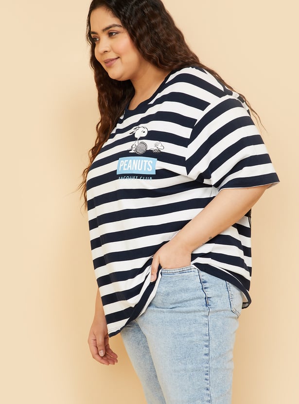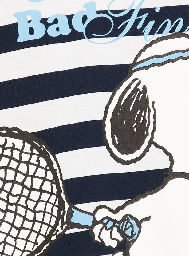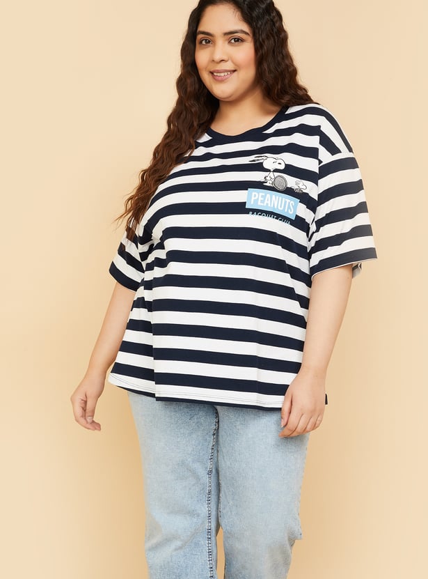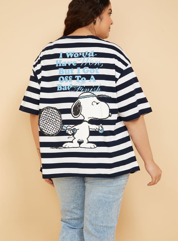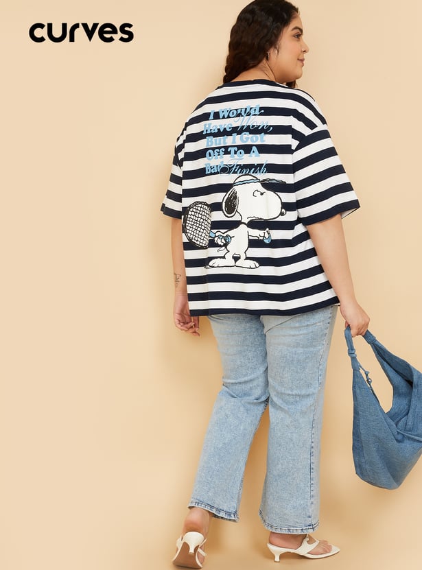 This oversized striped T-shirt pairs a playful Snoopy print with a relaxed drop-shoulder silhouette for laid-back charm. The round neck and half sleeves keep it easy, breezy, and perfect for everyday comfort. Model Size :