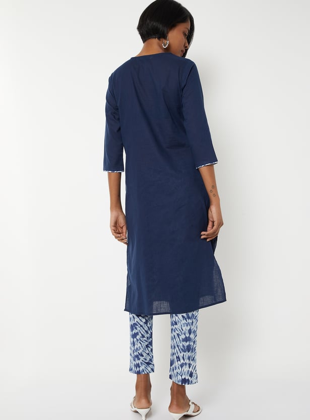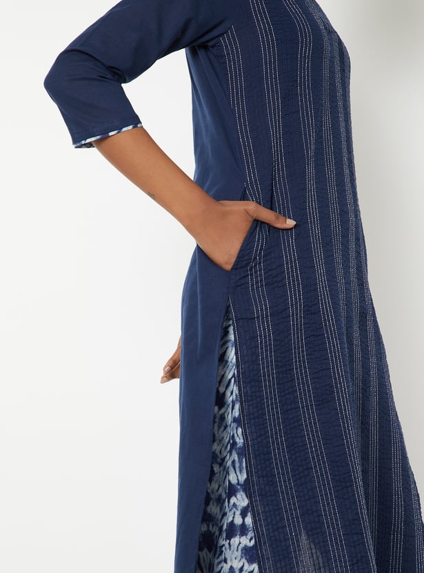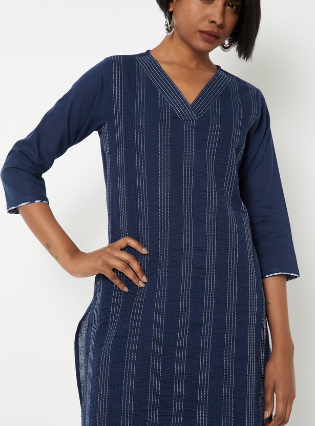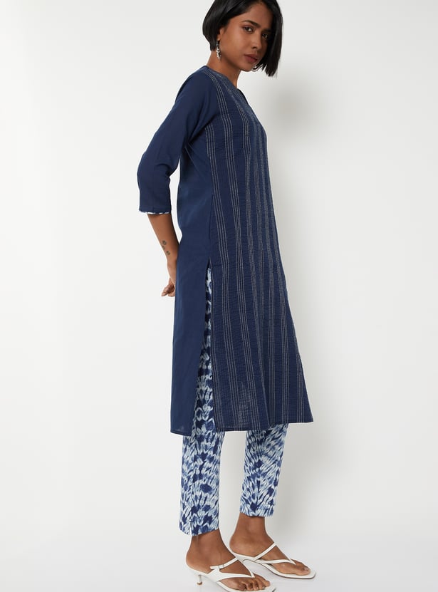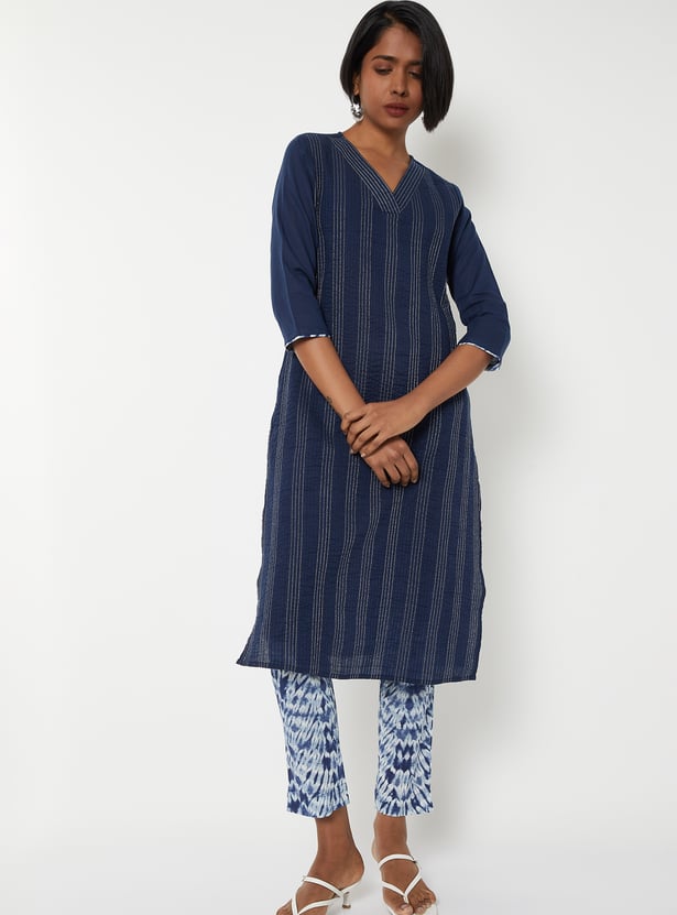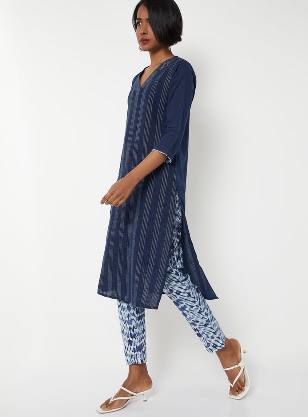 Bring effortless elegance to your ethnic wardrobe with this striped straight kurta set, featuring a flattering V-neck, chic 3/4th sleeves, practical side slits, and a handy side pocket. It is paired with printed straight pants crafted with an elasticated waist, offering both versatility and comfort.
