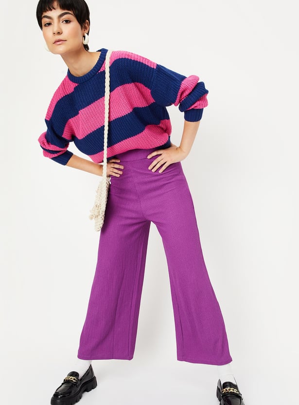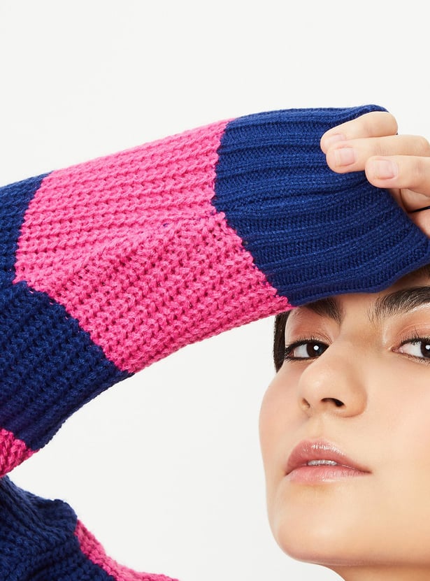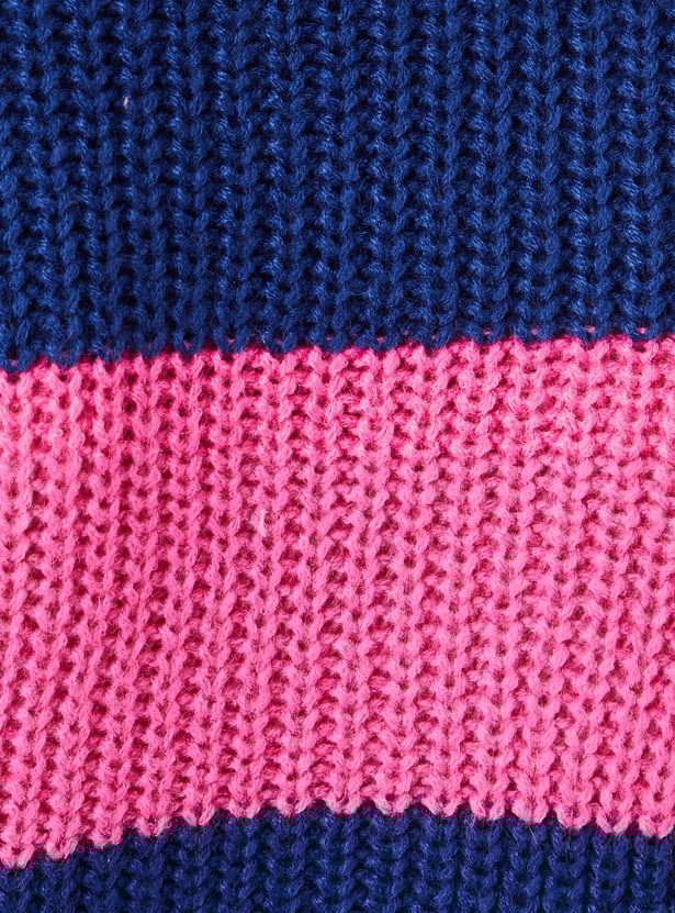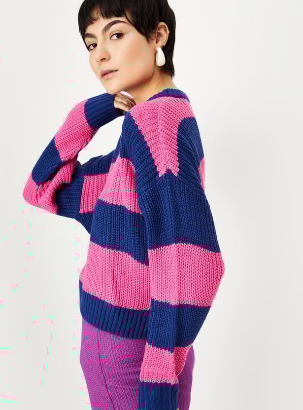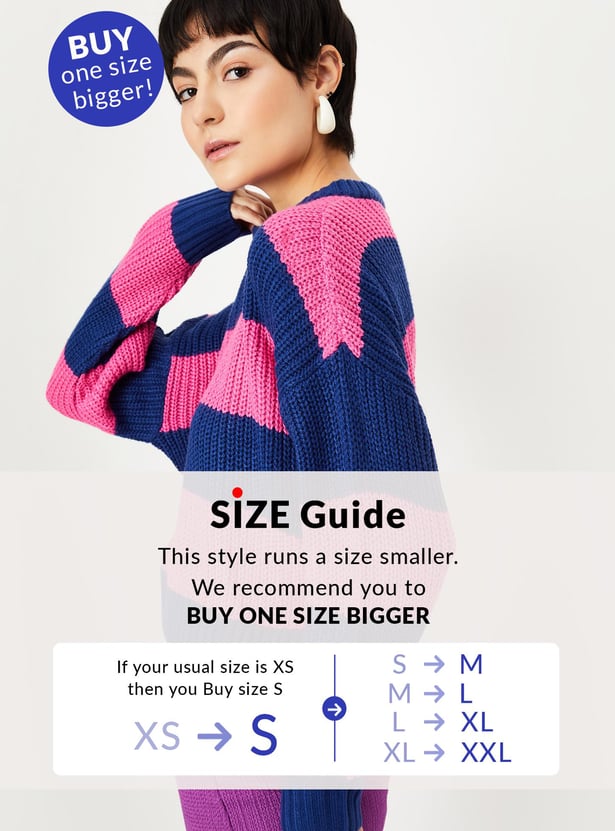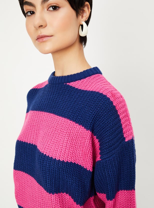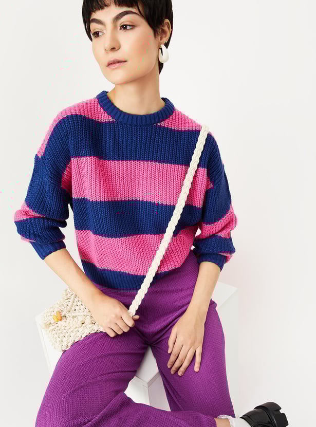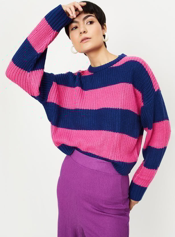 Set yourself for winter with this striped sweater featuring a round neck, drop shoulder, full sleeves, and ribbed hem, Style it with a pair of jeans and sneakers for a cosy look.