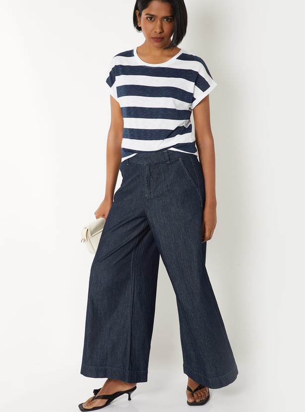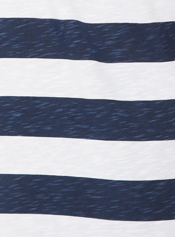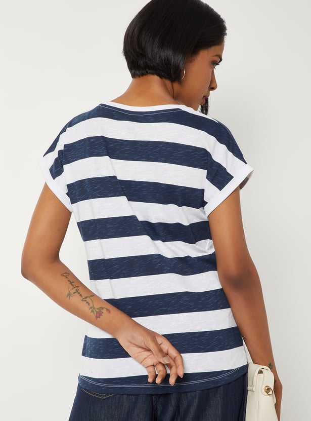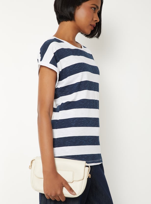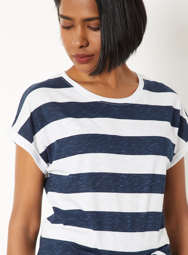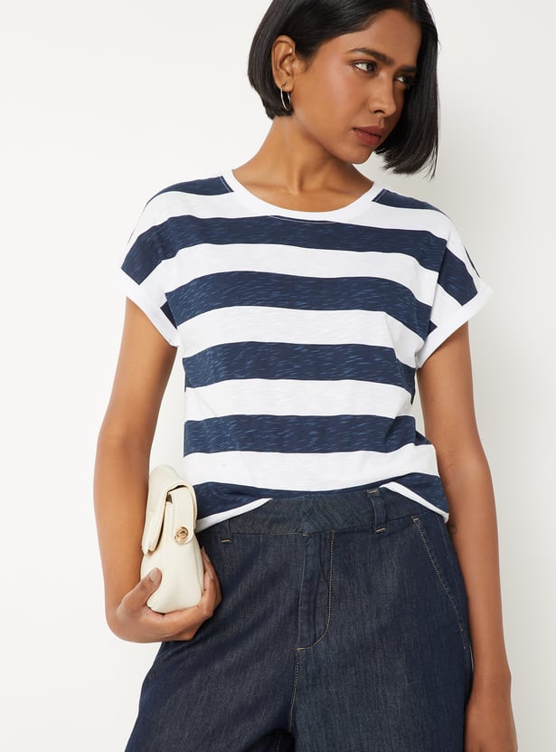 Add a timeless touch to your wardrobe with this striped T‑shirt, designed for effortless everyday style. Crafted with a classic round neckline and half sleeves, this striped T‑shirt is made from soft, breathable fabric to keep you comfortable while looking chic. Model Size :