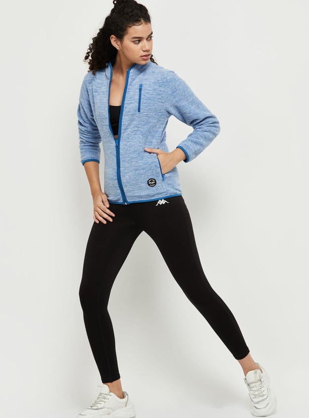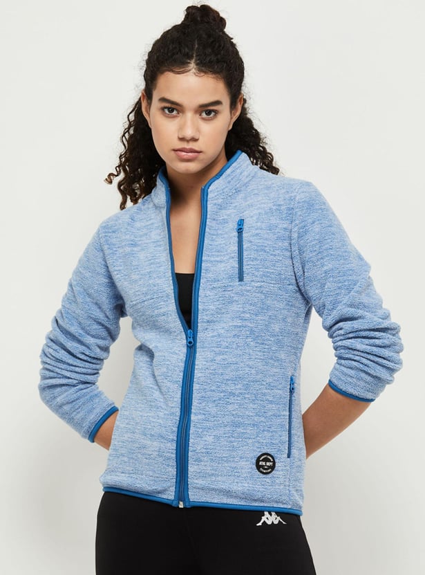 Layer up your outfit with a fleece sweatshirt fashioned with a baseball collar, zip front, long sleeves, and multiple zip pockets. Complete the sporty style with a sports bra, joggers, and sneakers.