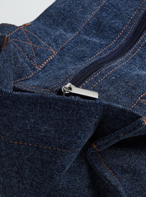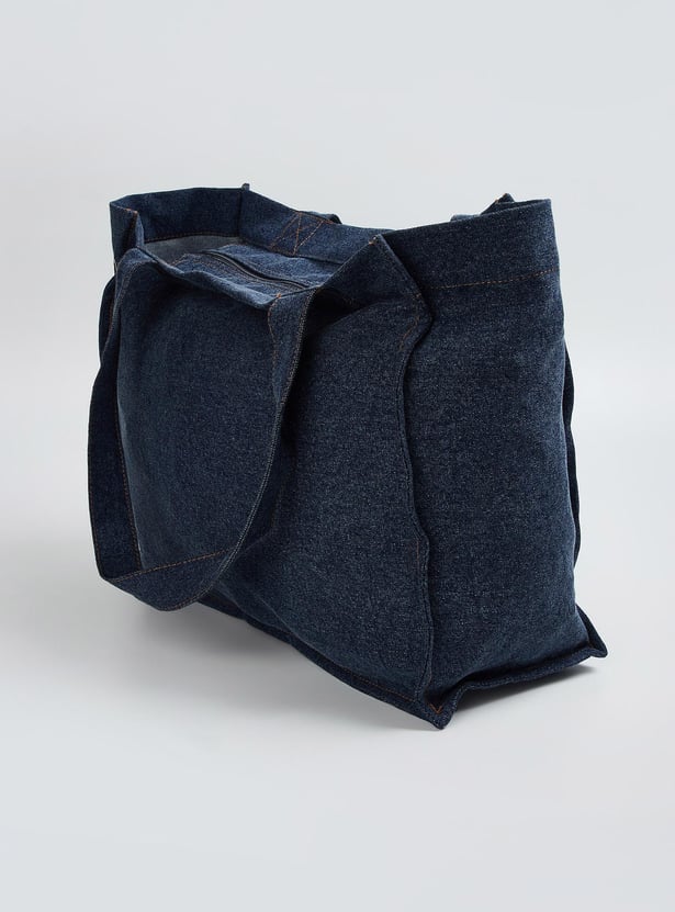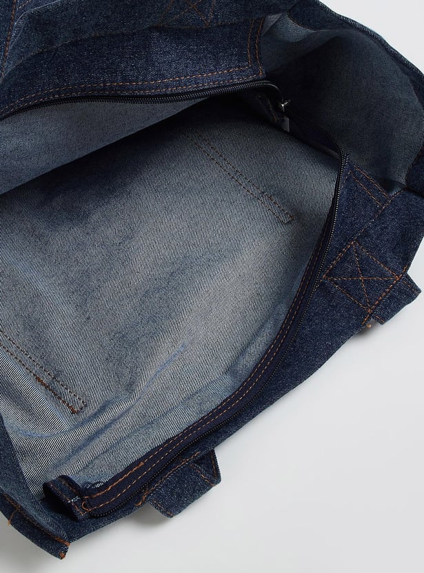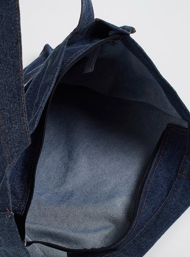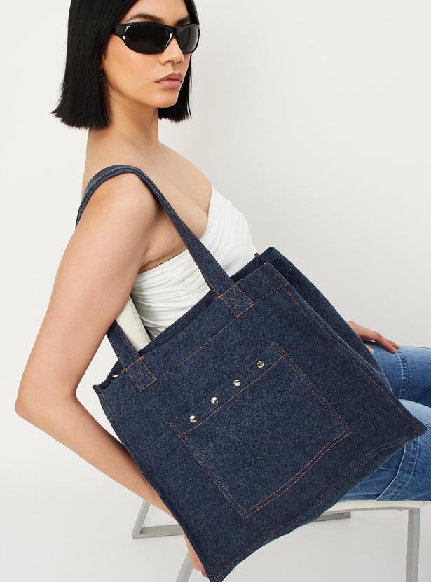 Make a chic statement with this shopper bag made of denim that offers both style and practicality with its spacious interior and versatile design. It has two sturdy handles, one roomy compartment with a zip closure, and one outer pocket. The grommet detailing on the pocket lends an edgy touch.