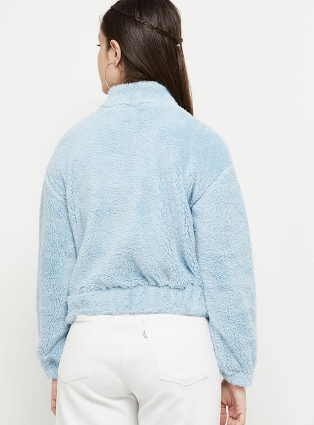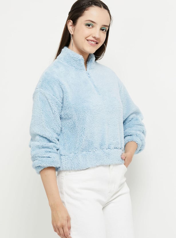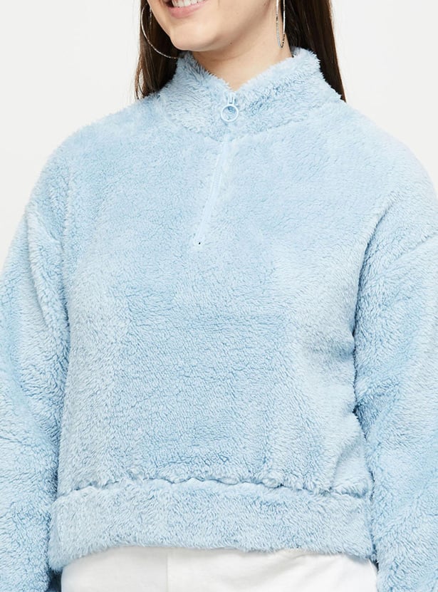 Women Textured Full Sleeves Zip Closure Cropped Sweatshirt