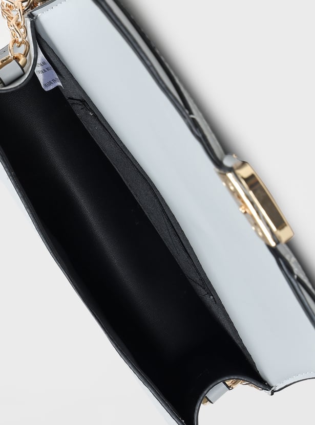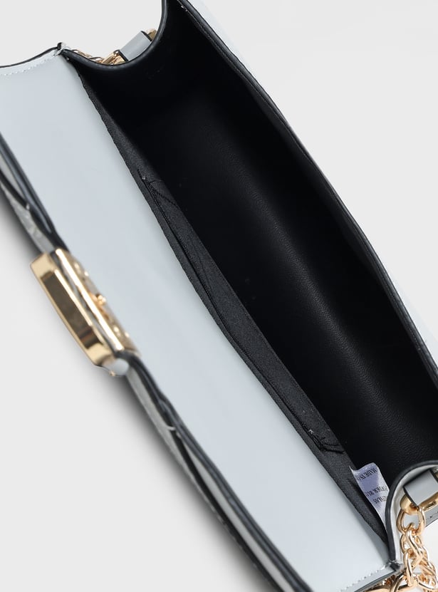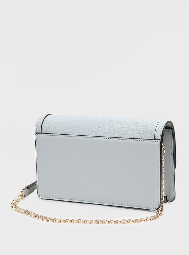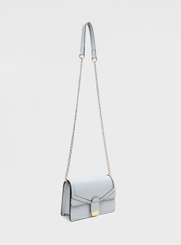 Add a chic accessory to your outfit with this textured sling bag, featuring a push-button closure and a stylish chain sling strap. Its compact design makes it perfect for carrying essentials on the go.