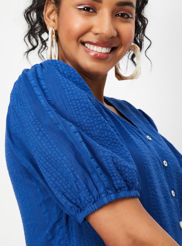 Introducing this versatile and stylish textured dress, a timeless addition to your wardrobe. With a V-neck, puffed sleeves, a tiered profile, and convenient side pockets, this dress seamlessly combines fashion and functionality.