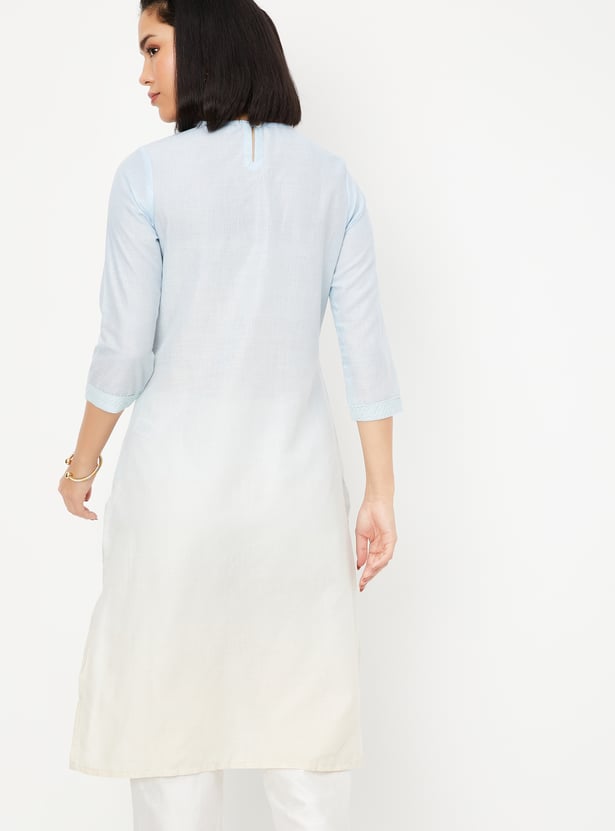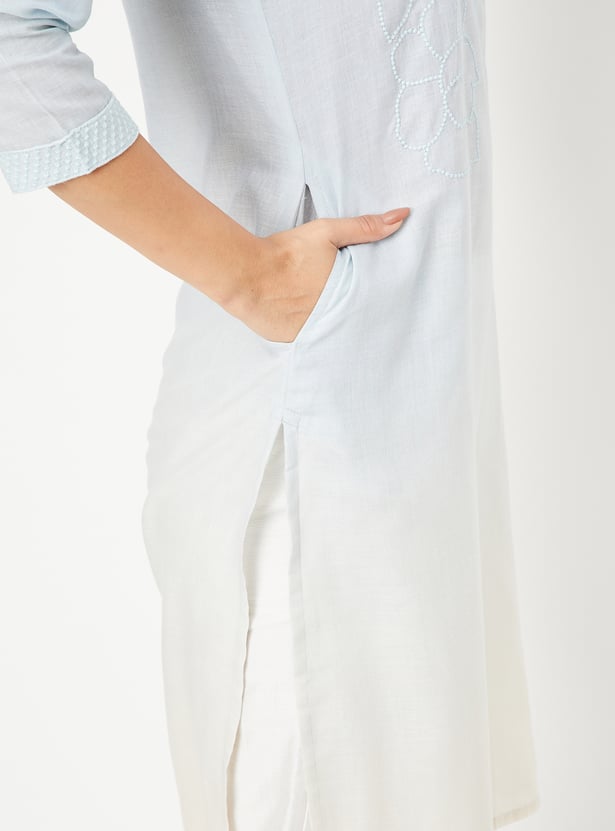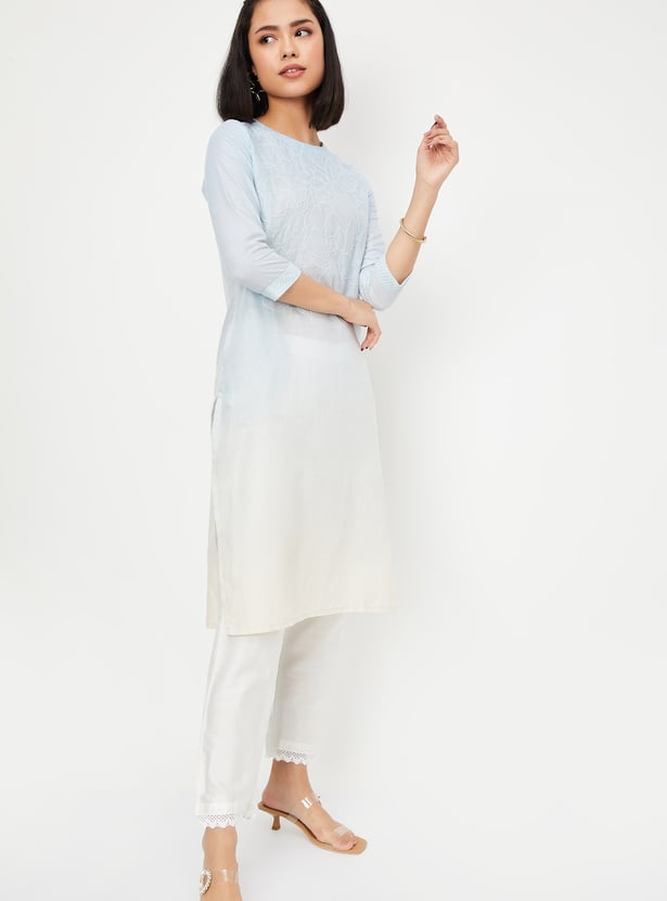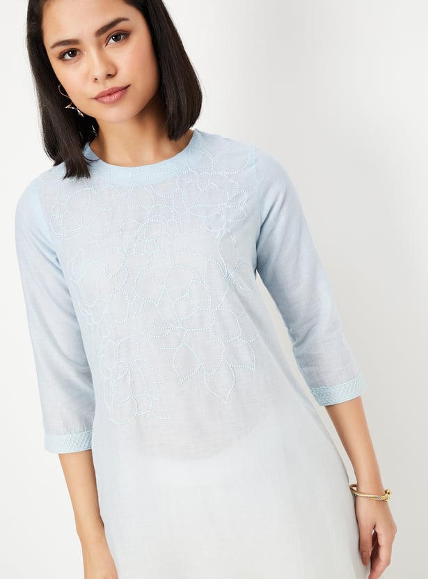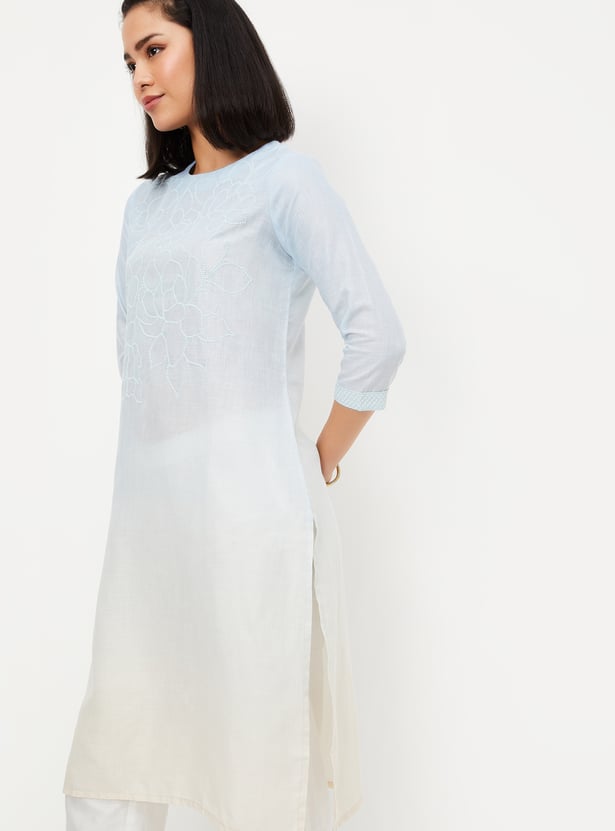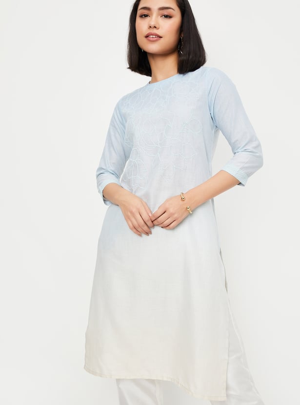 This embroidered straight kurta is a perfect blend of elegance and comfort. Featuring a flattering round-neck, 3/4th sleeves, side pocket, and side slits, it offers a chic and breezy silhouette. The intricate thread embroidery adds a touch of traditional charm, making it ideal for both casual and festive occasions.
