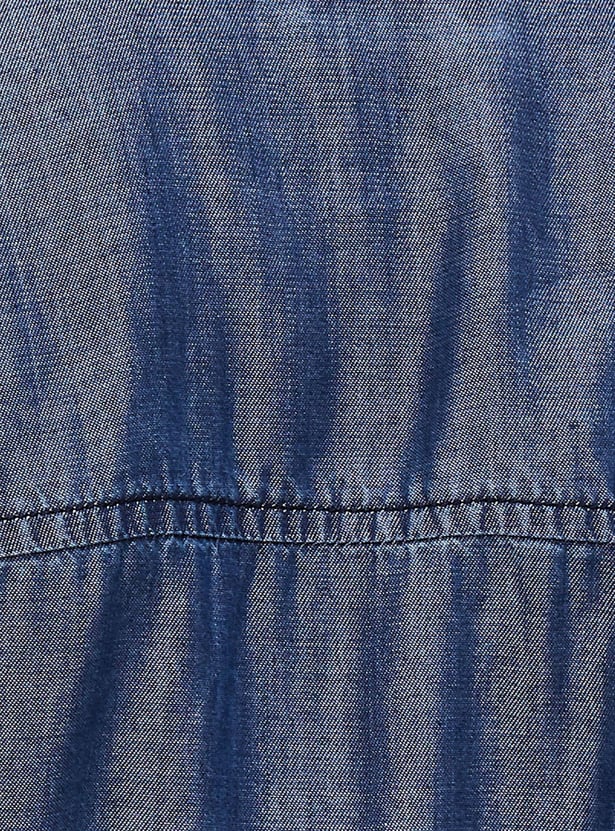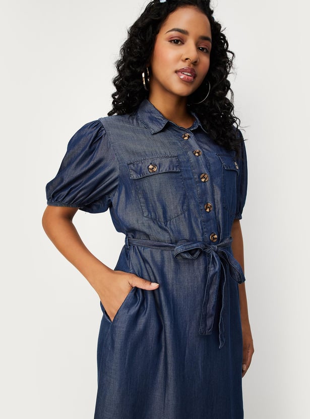 Look casual best with this denim dress. It has a midi-length profile with a spread collar, puffed sleeves, and a button placket. This dress is updated with double flap button pockets, waist pockets and a fabric tie-up at the waist, combining style and comfort. Complement this dress with sneakers to ace your style.