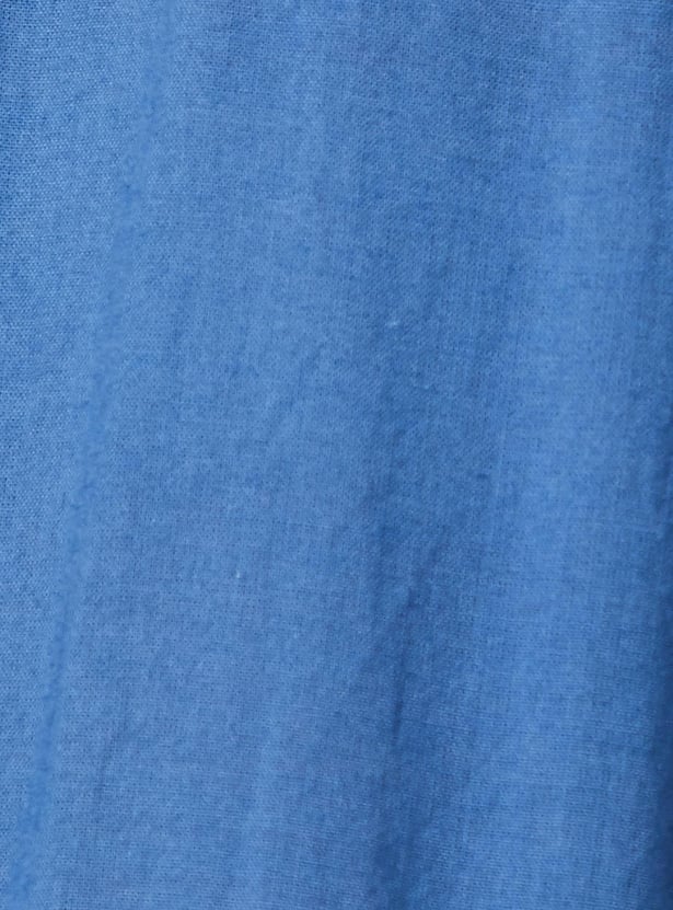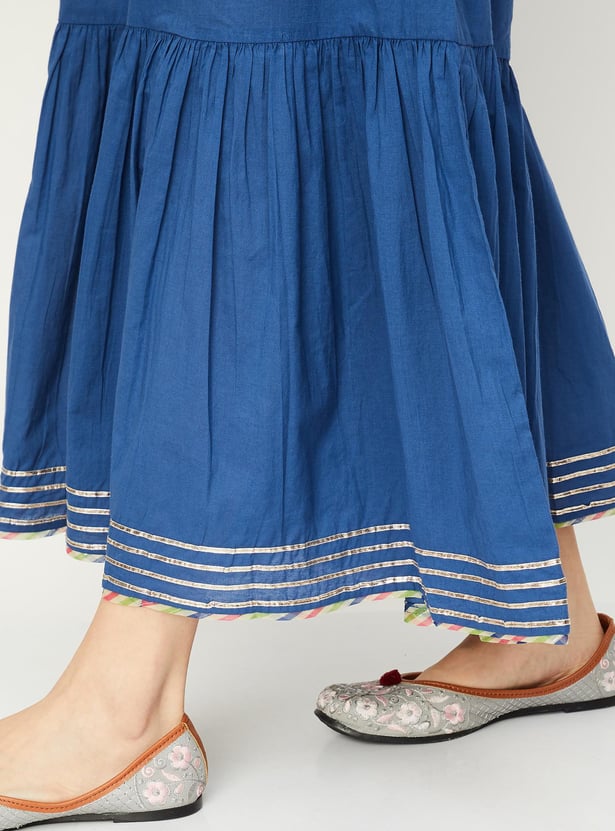 This pair of sharara pants is the ideal essential for ethnic occasions. It features a solid surface, it has a three-tiered profile, an elasticized waistline and an inner lining. Style it with a short kurti and bangles.