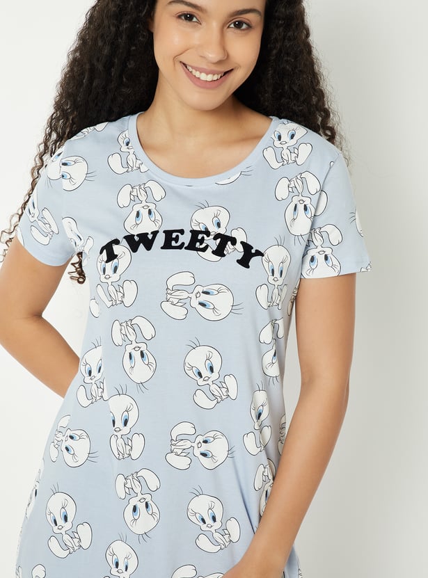 An above-knee printed chemise designed with half sleeves and a round neck, finished with a playful Tweety print for a cute, easygoing sleepwear look.