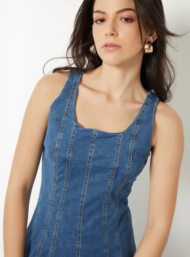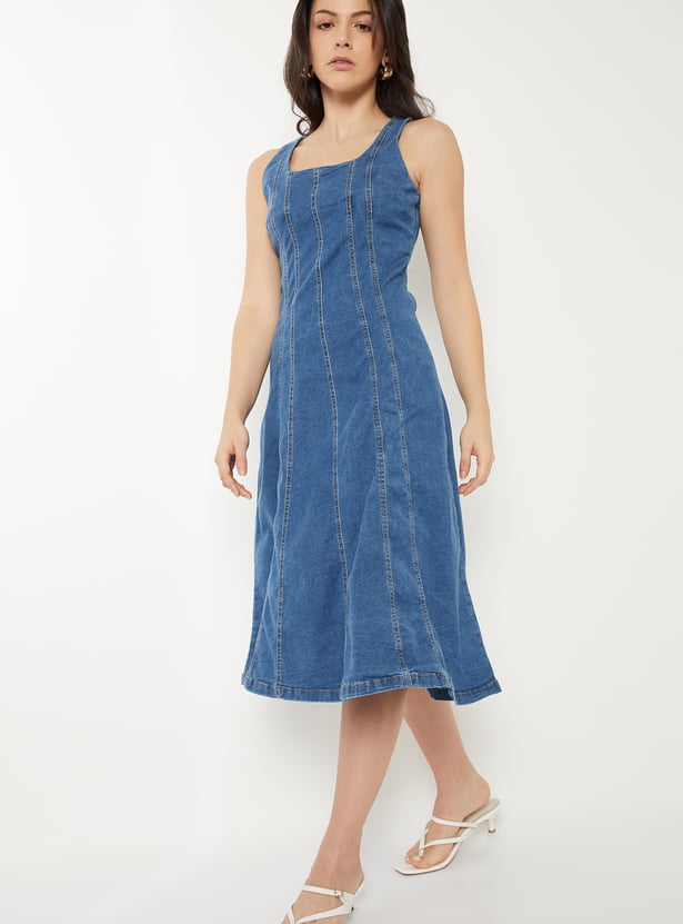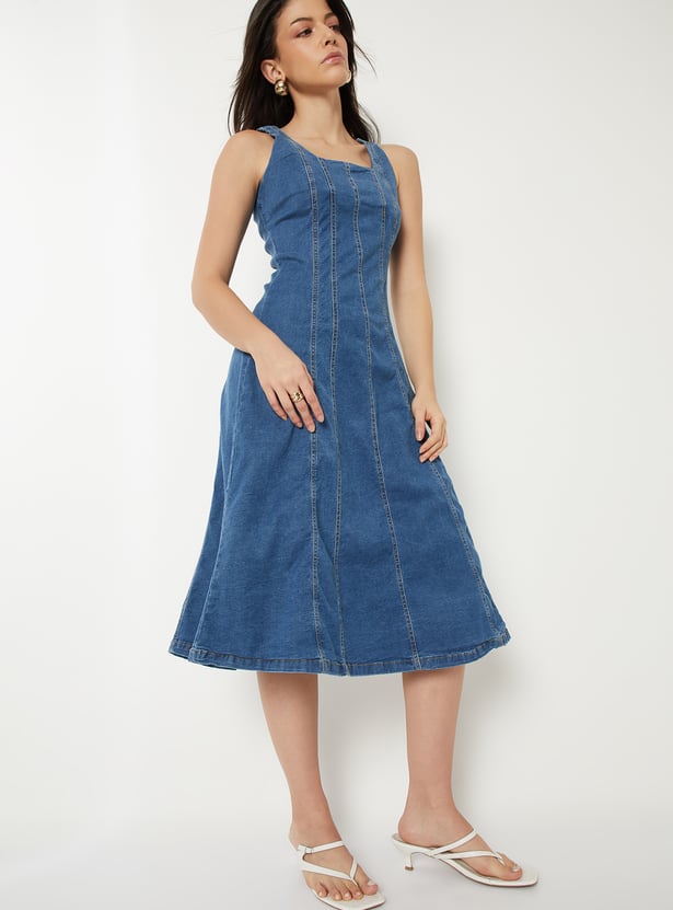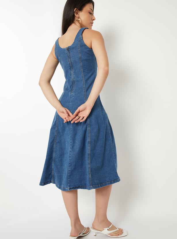 This fit & flare dress features a scoop neck, a sleeveless design, and a rear zipper closure. Additionally, it is complemented by a washed denim fabric.