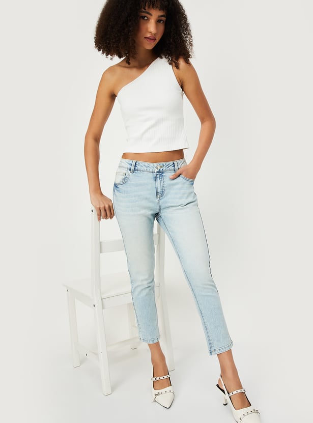 A versatile all-season favourite, these ankle-grazer jeans feature a button front, mid-rise waist with belt loops, and five pockets. The washed design and ankle-length profile add a stylish touch.