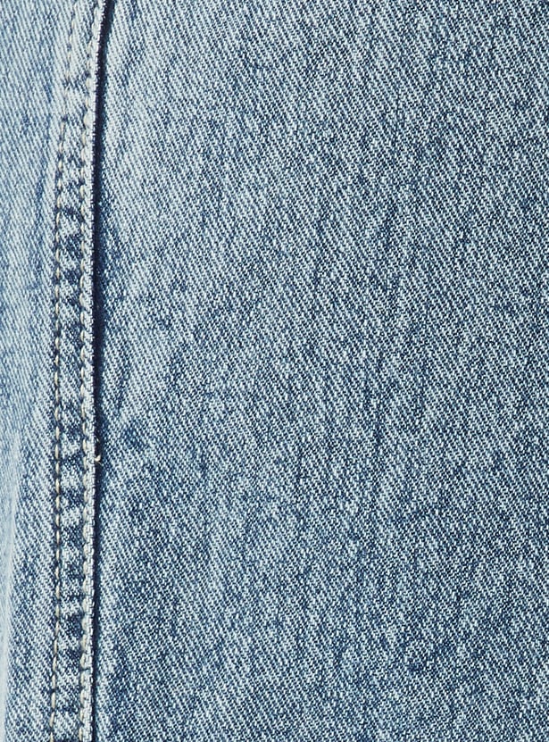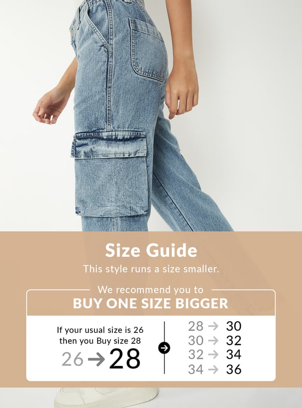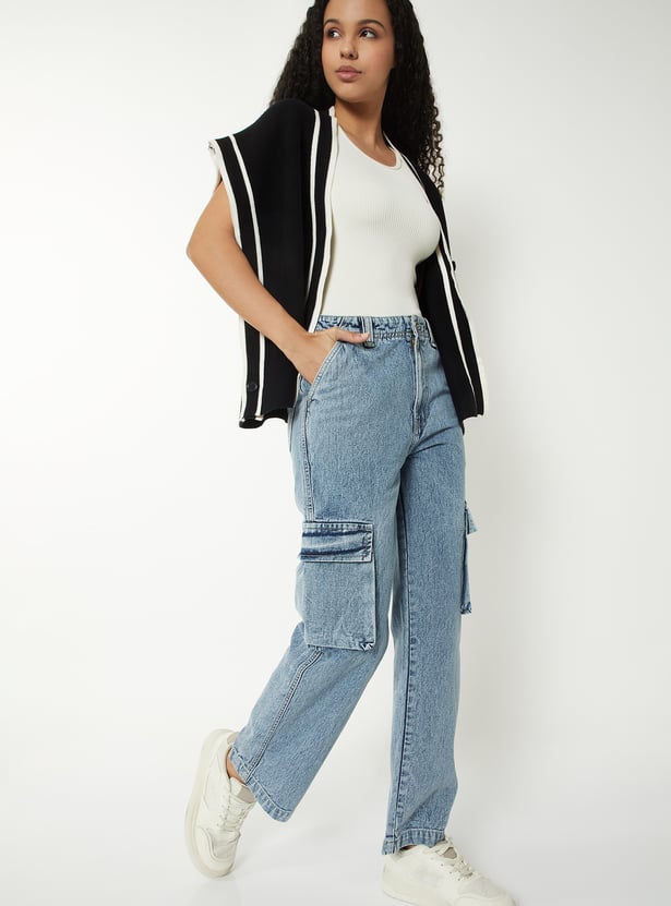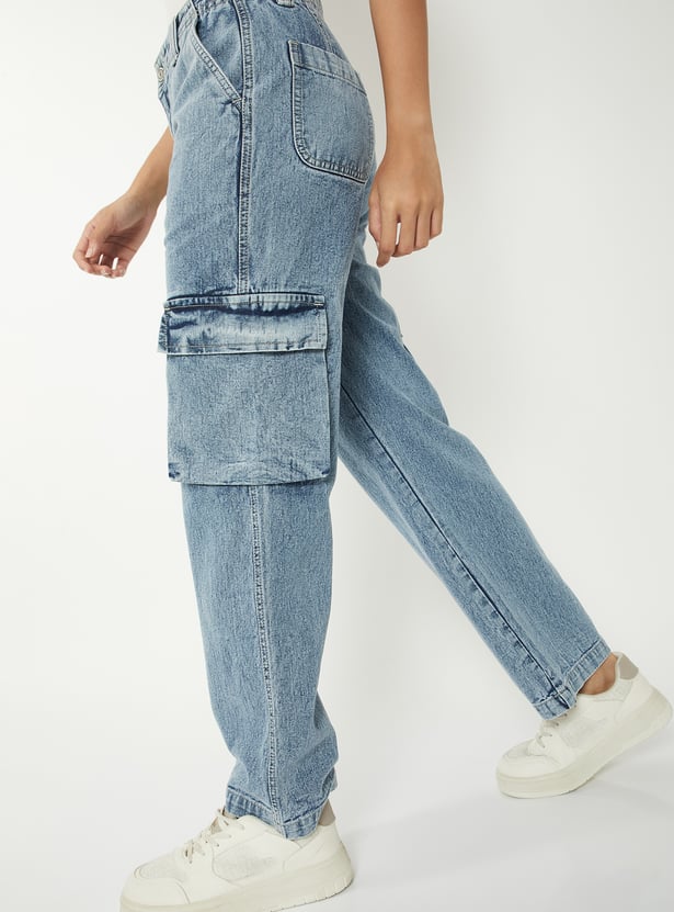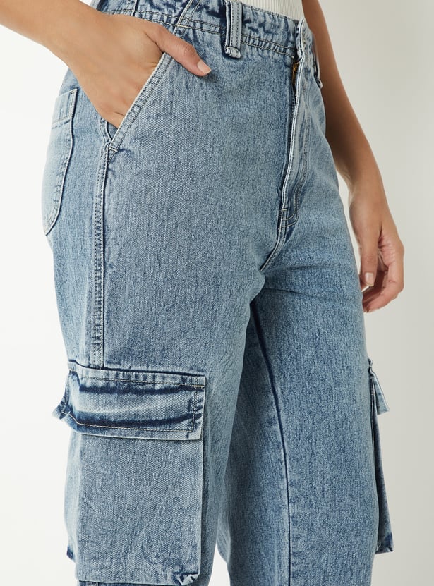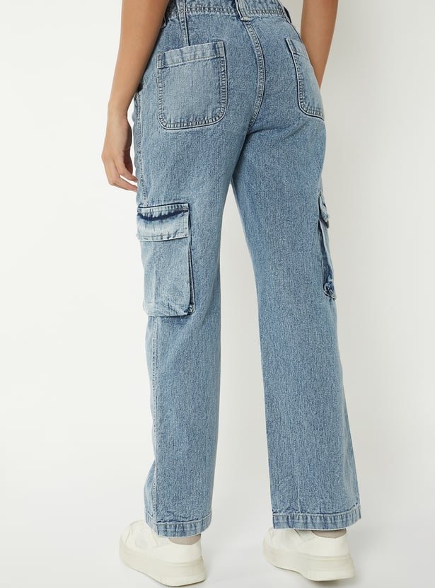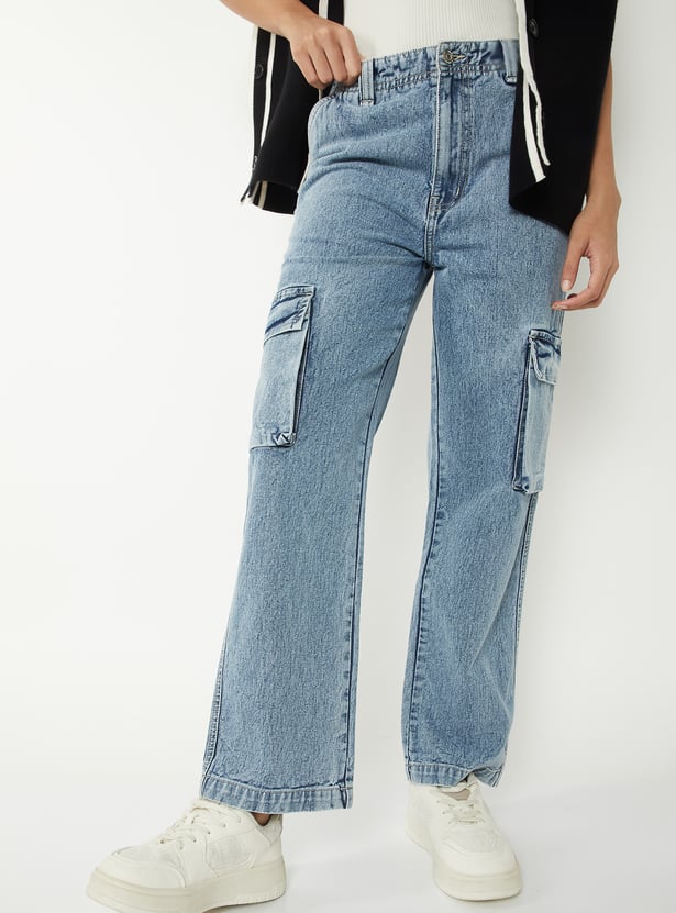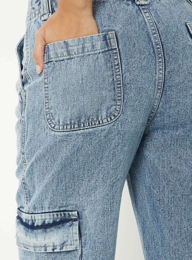 These washed mid-rise cargo jeans feature six pockets, belt loops, and a classic zip-and-button closure for a utility-driven look. The washed finish adds a laid-back, lived-in vibe to the structured silhouette.
