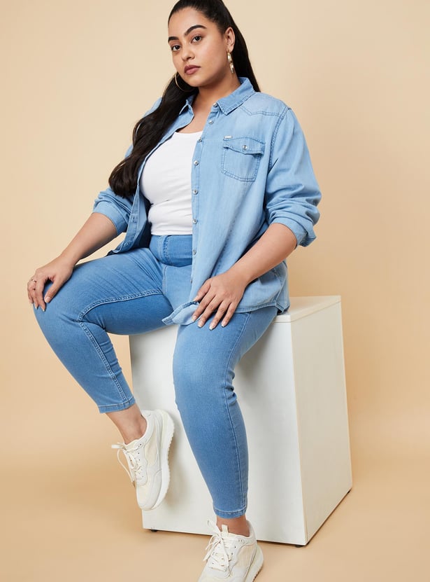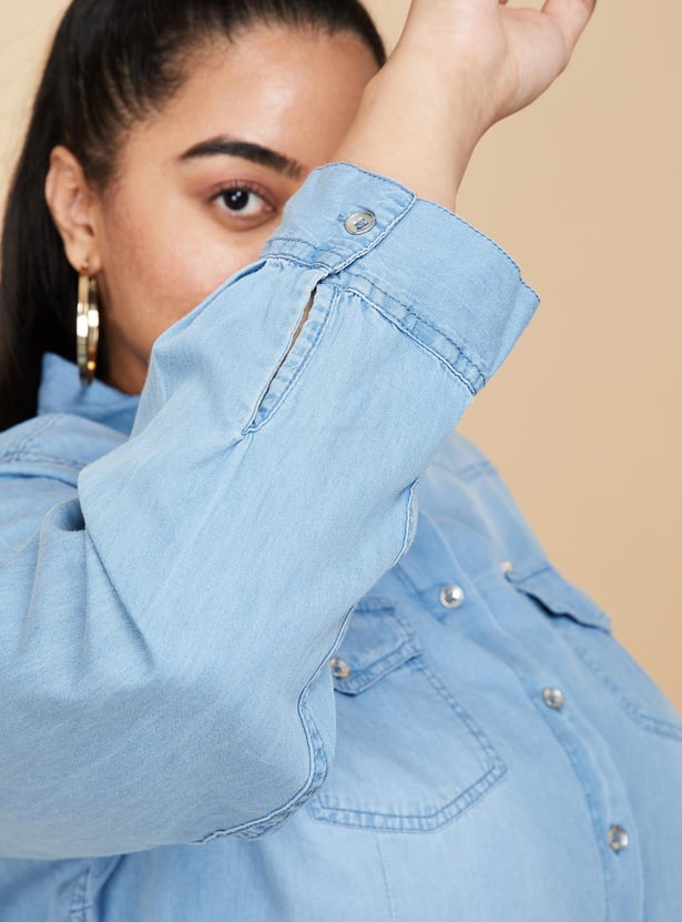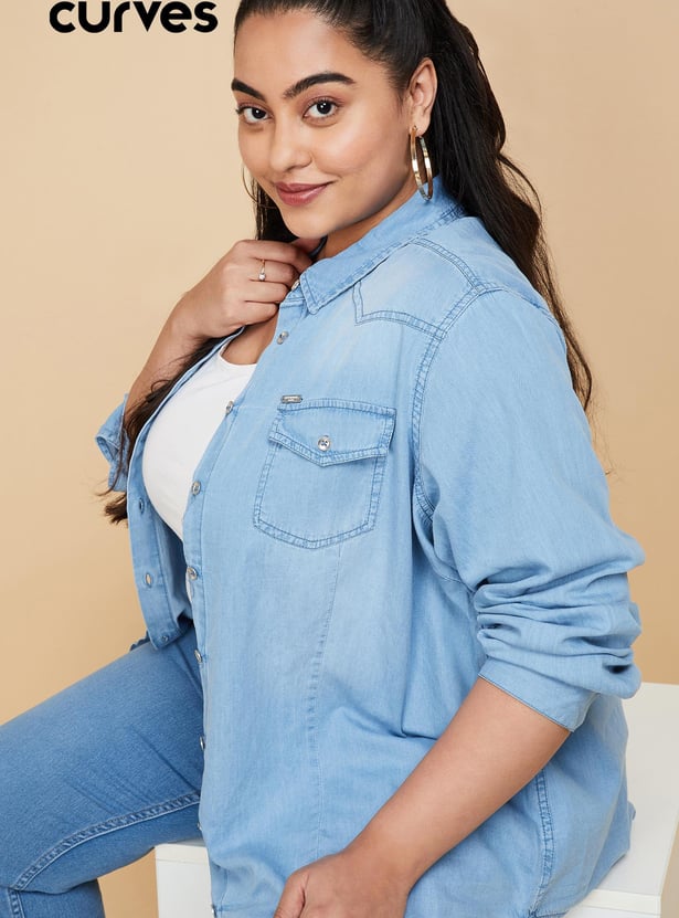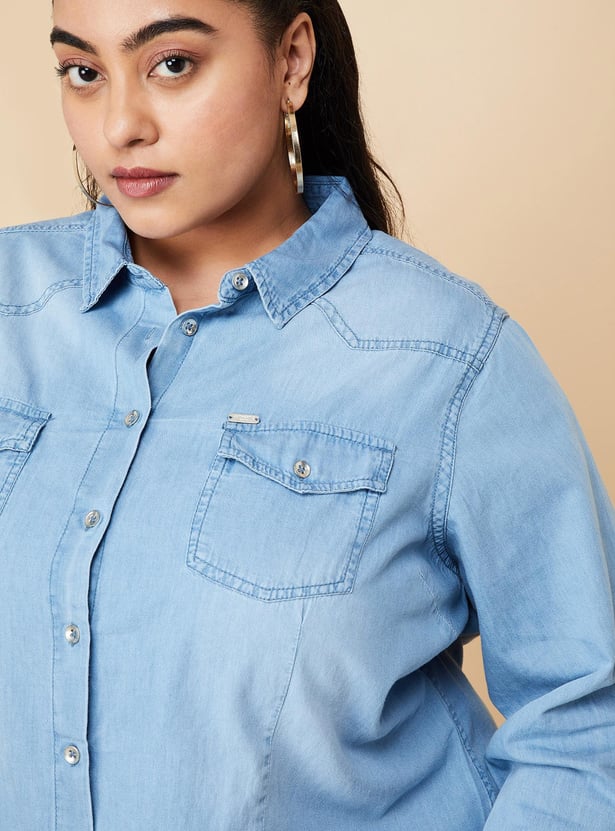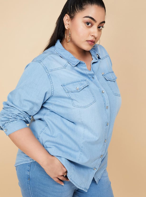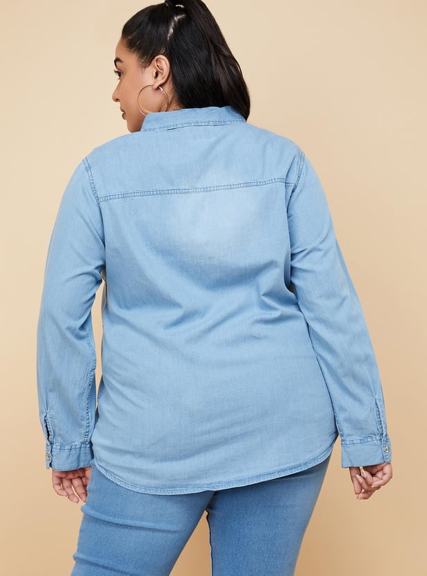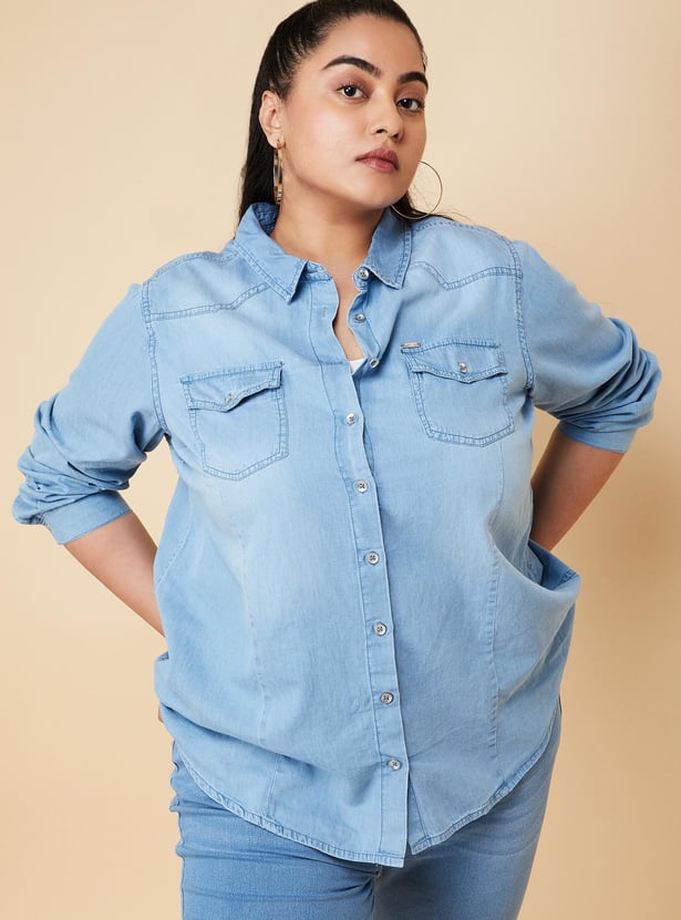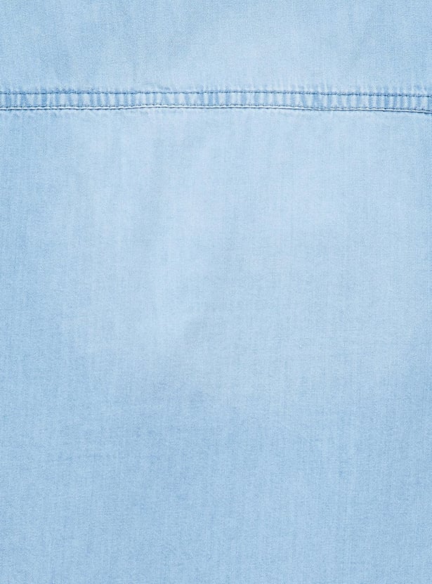 A perfect addition to your wardrobe, this denim shirt features a washed finish. It has a spread collar, long sleeves, buttoned cuffs, flap pockets with button closures, and a curved hem.