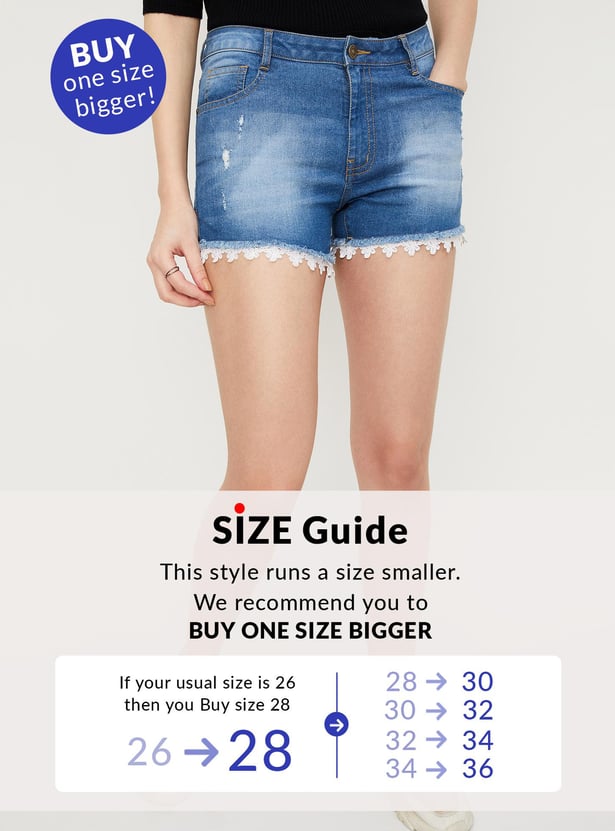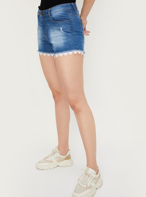 As the temperature soars, slip into the comfort of this pair of denim shorts. It features a washed effect, a belt loop waist, button and zip closure, and a lace hem.