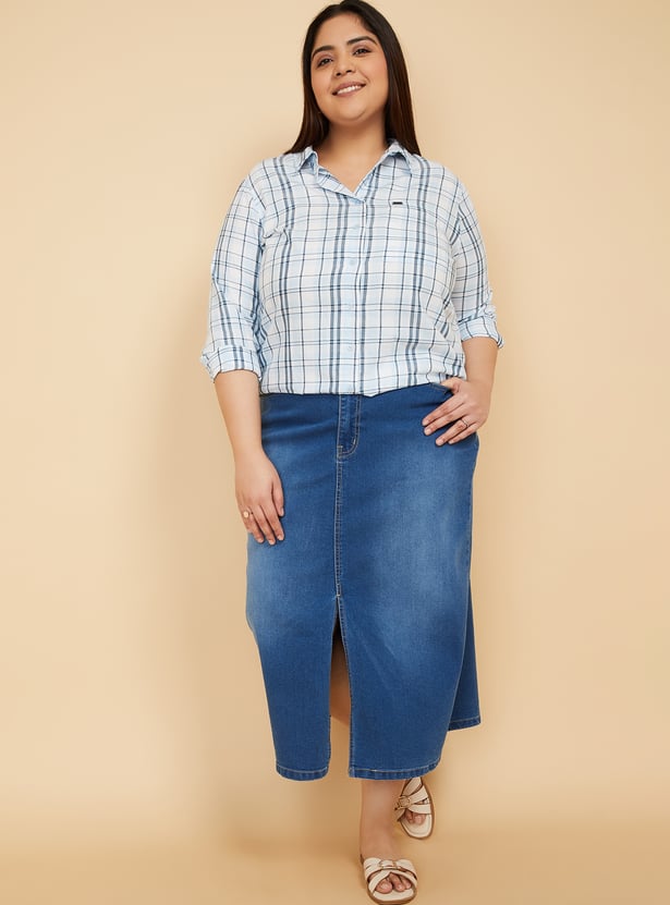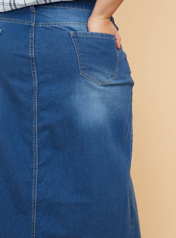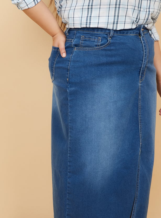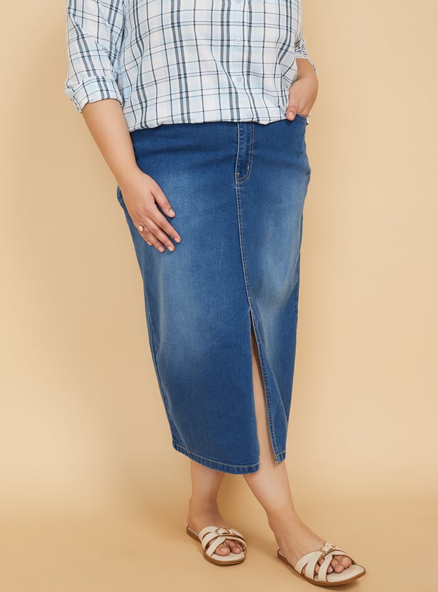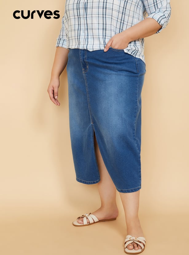 Elevate your casual chic style with this washed pencil skirt featuring a front slit, belt loops, multiple pockets, and a button-zip closure, combining the timeless appeal of denim with a modern and flirtatious touch. The washed finish adds a laid-back vibe to the skirt's versatility, making it a fashion-forward choice for casual outings and more elevated looks. Model Size :