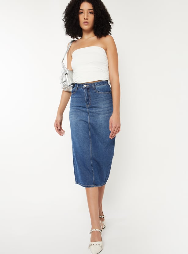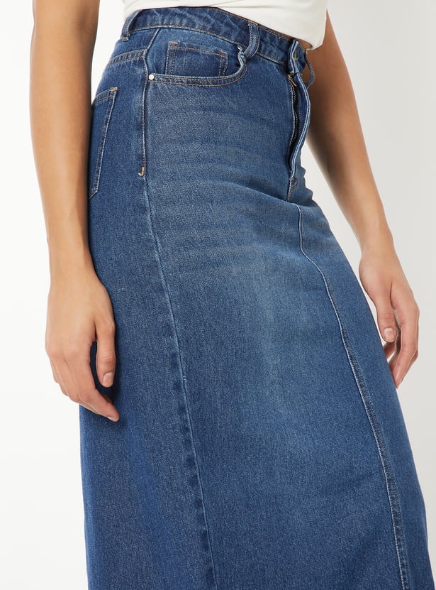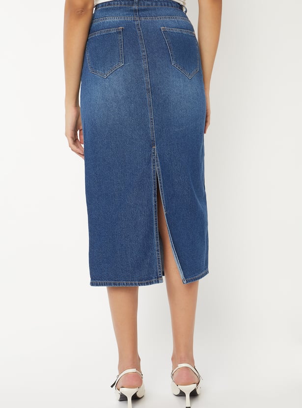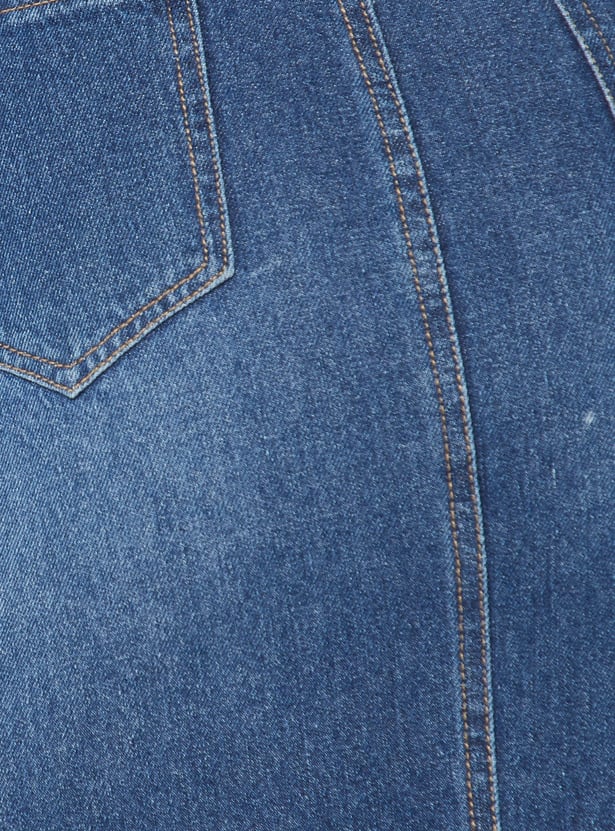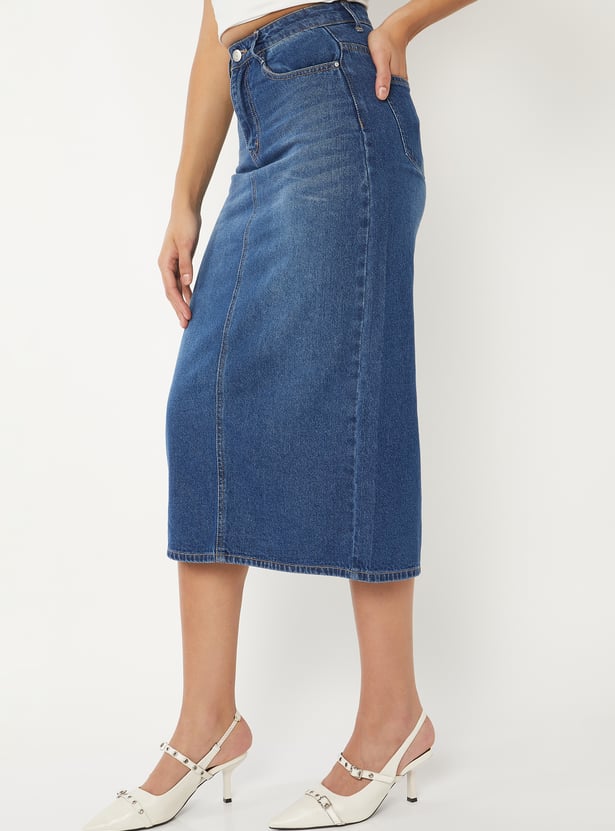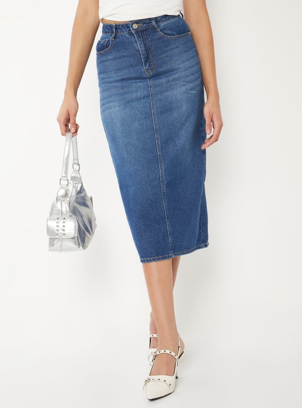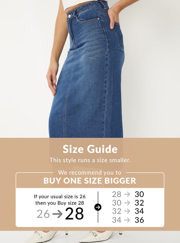 Designed for daily wear, this women’s washed denim skirt features a classic knee-length cut with a balanced, flattering fit. Two side pockets and back pockets add practical detailing, while the zip and button closure with belt loops keep it timeless and easy to wear.
