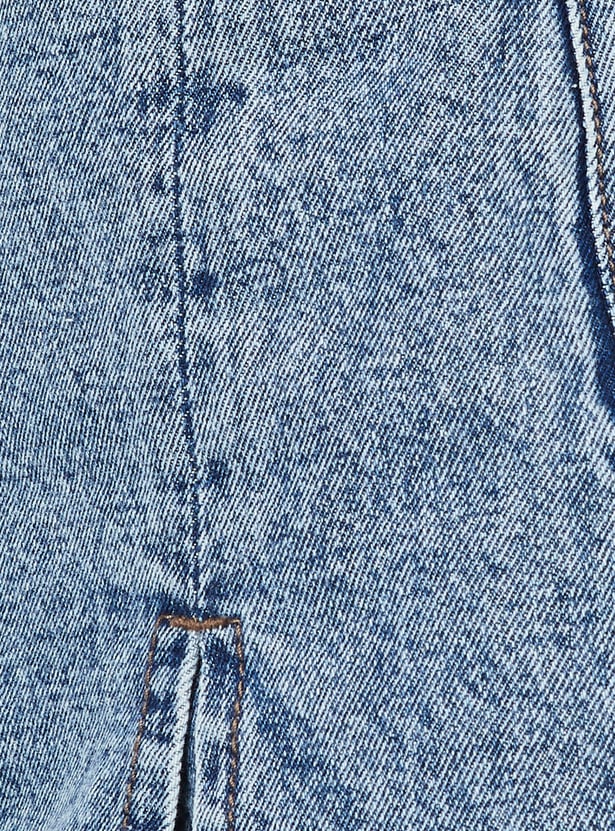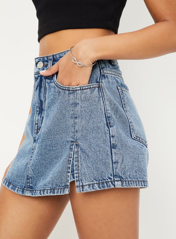These washed denim skorts combine the look of a skirt with the ease of shorts, featuring a button closure and belt loops for a classic denim finish. Perfect for adding a playful twist to your casual wardrobe.