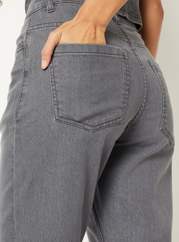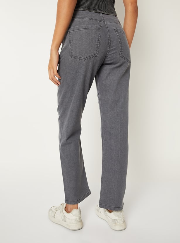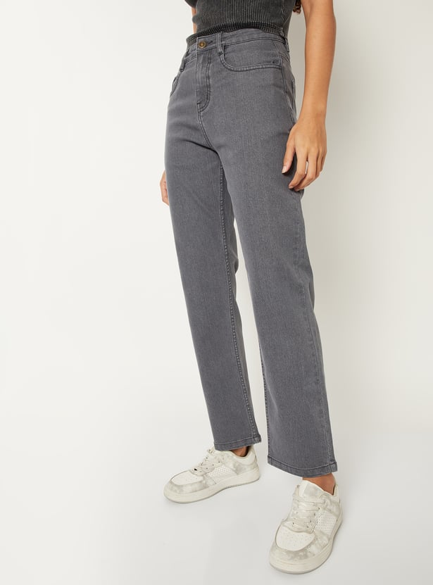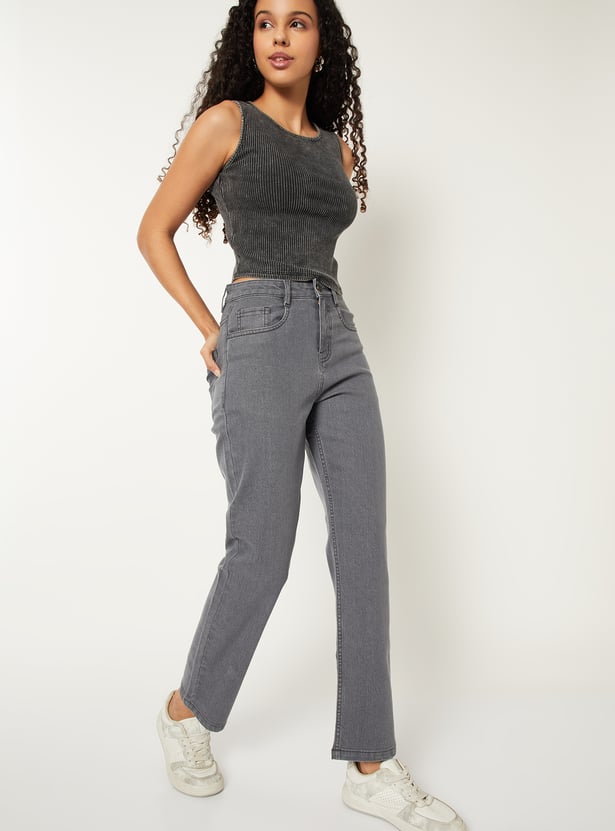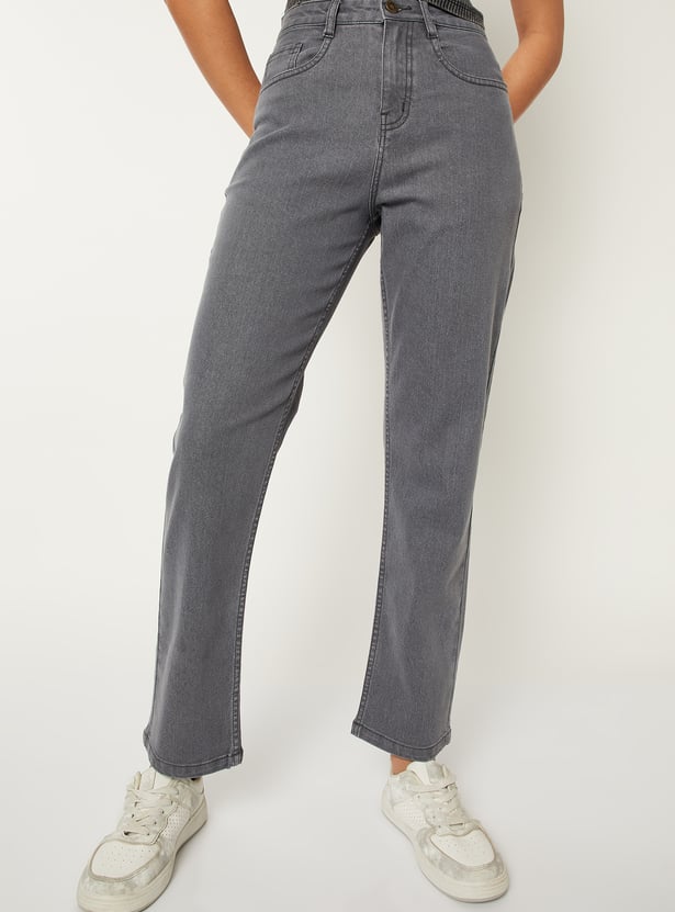 Add a timeless classic to your denim collection with these washed high-rise slim straight jeans. Featuring a button closure, belt loops, and functional pockets, they offer a flattering fit with everyday versatility.
