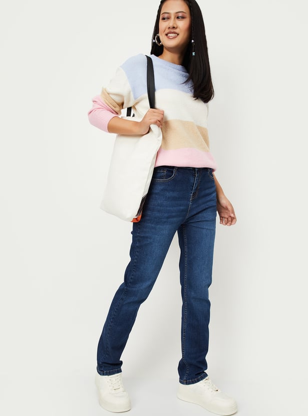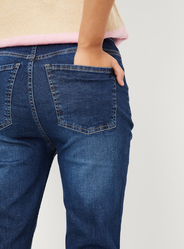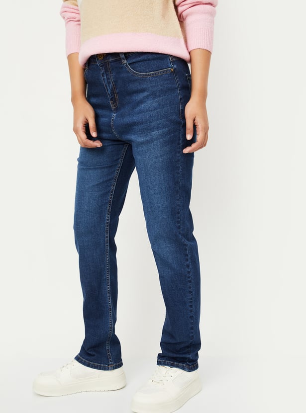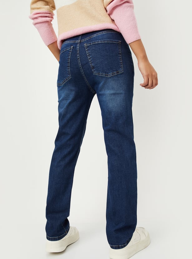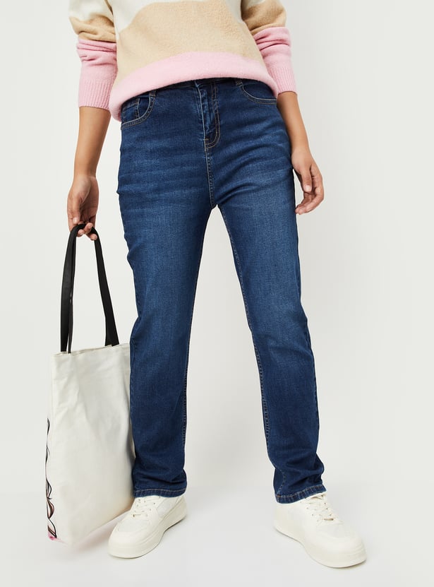Upgrade your denim collection with these washed slim straight jeans, featuring a flattering high-rise waist, button closure, belt loops, and a classic 5-pocket design. The subtle wash adds a lived-in feel to this timeless silhouette.