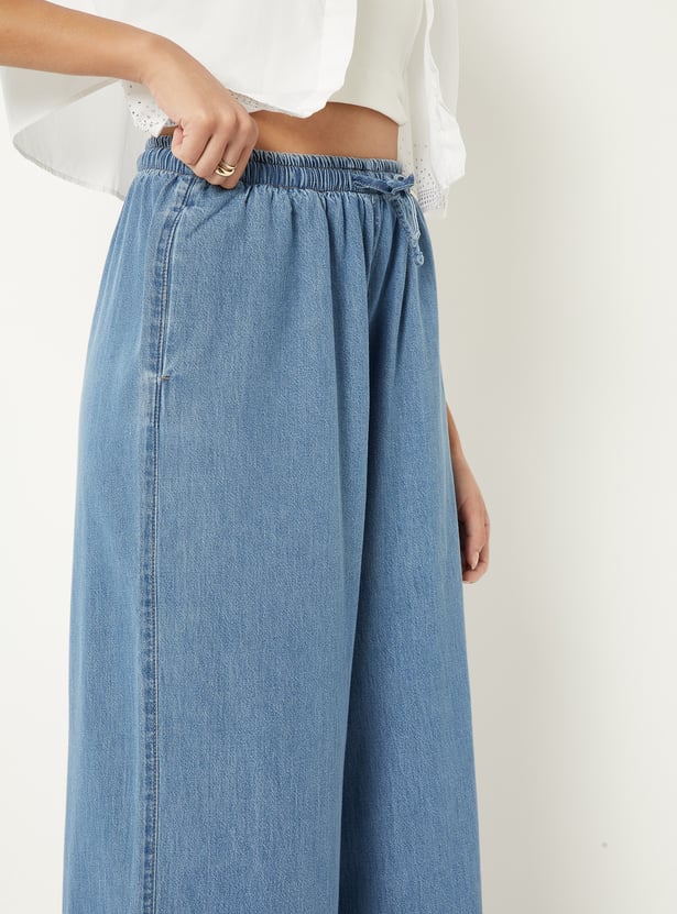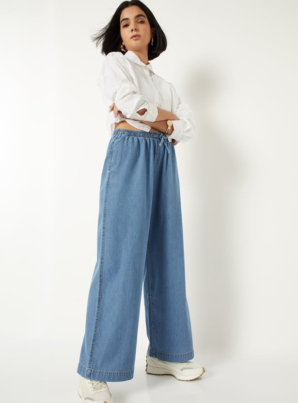 Refresh your denim collection with these washed wide leg jeans. Designed with a relaxed silhouette, they feature a drawstring closure and functional pockets for easy everyday wear.