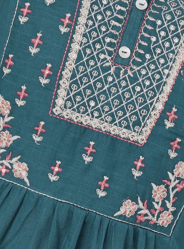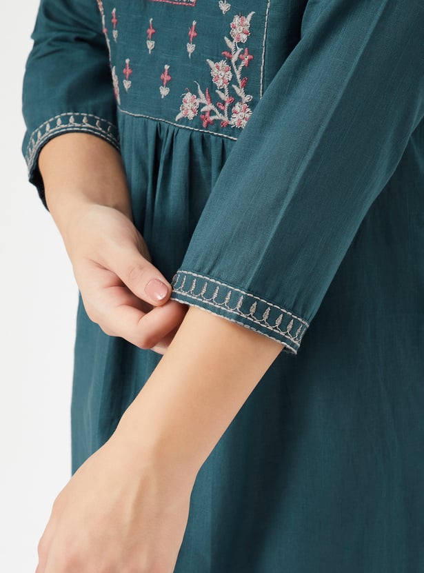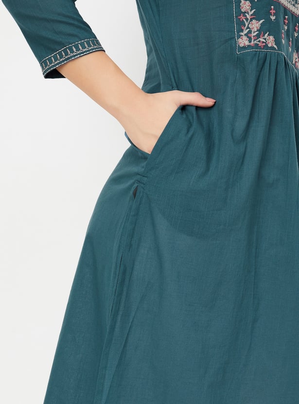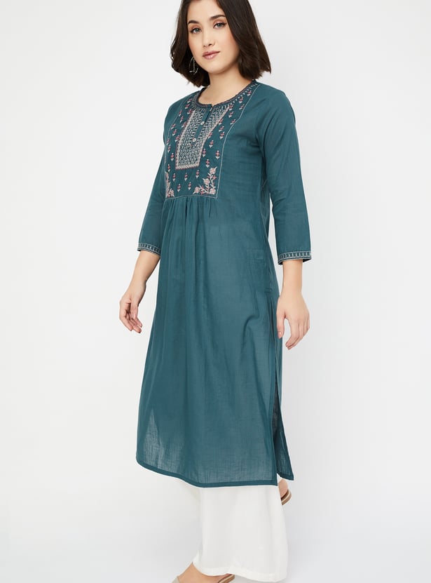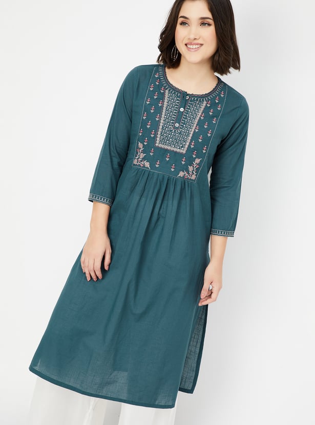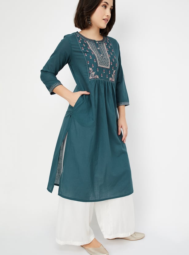 This yoke embroidered straight kurta combines traditional charm with modern style. Featuring a round neck, 3/4th sleeves, side slits, and a convenient side pocket, it’s designed for comfort and elegance.