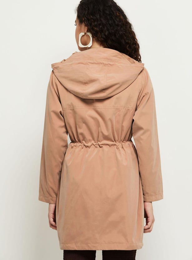Women Solid Hooded Long Jacket with Drawstring Waist