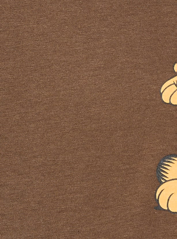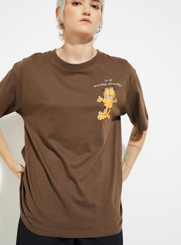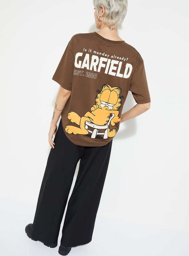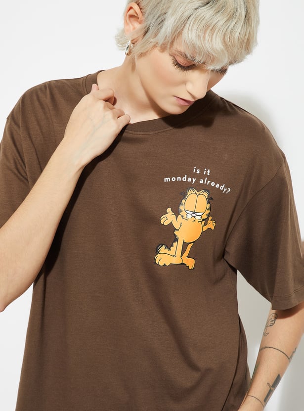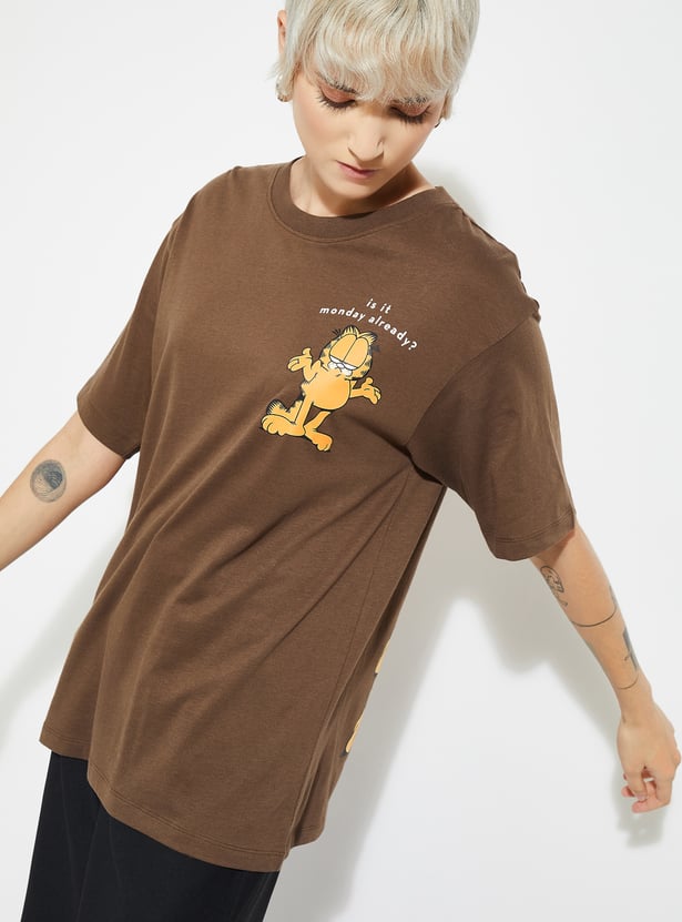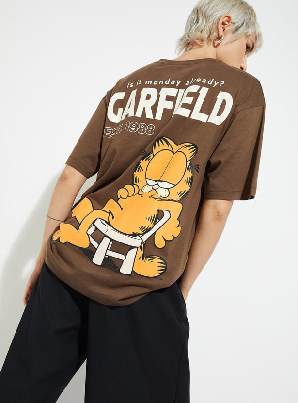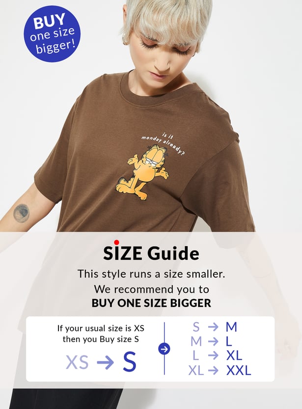 Add a playful twist to your casual wardrobe with this Garfield print oversized T-shirt, designed with a round neck and half sleeves for laid-back comfort. Model Size :