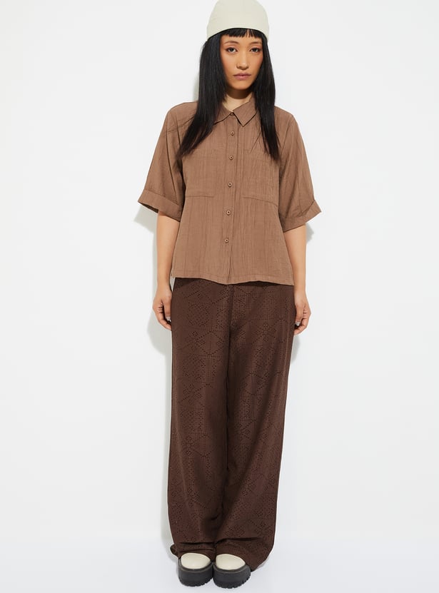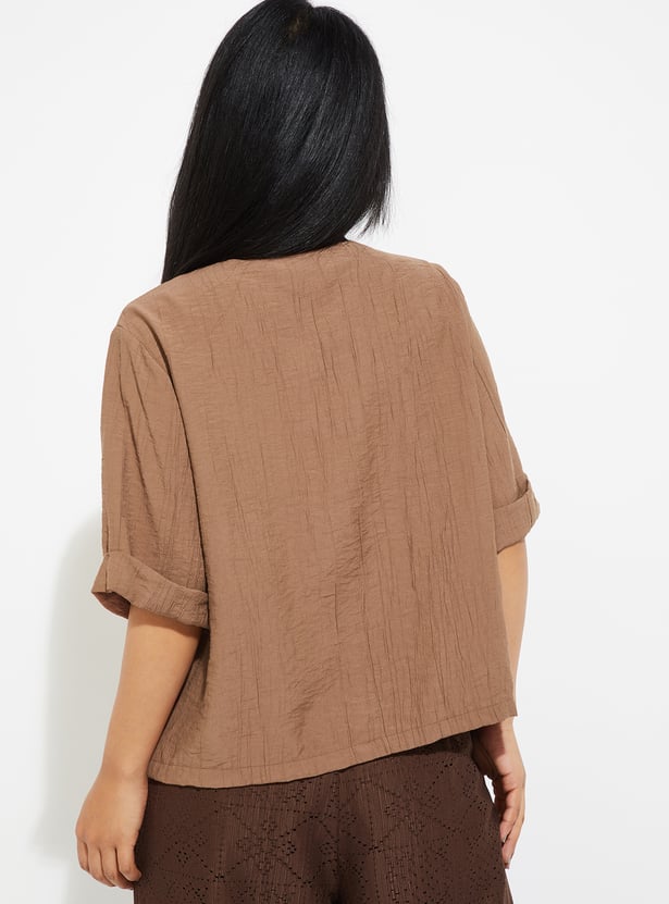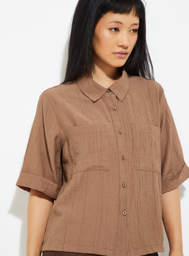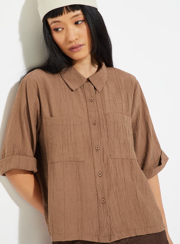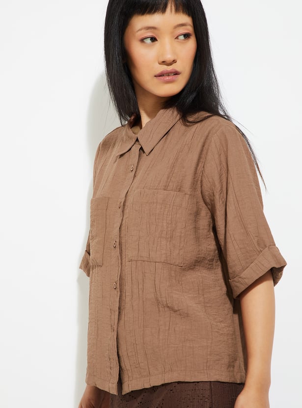 Elevate your casual wardrobe with this textured shirt. Designed with a spread collar and half sleeves, it features double patch pockets on the chest for a utilitarian touch. The textured finish adds subtle depth.