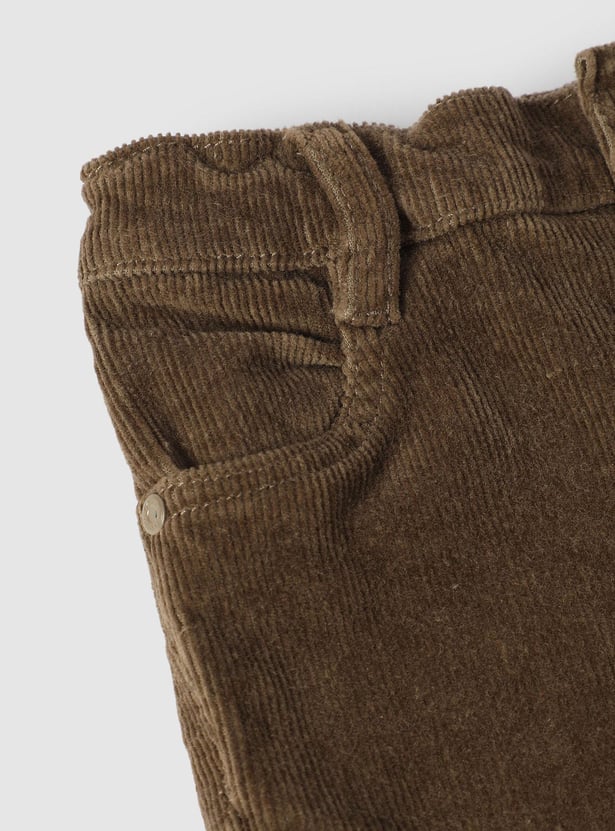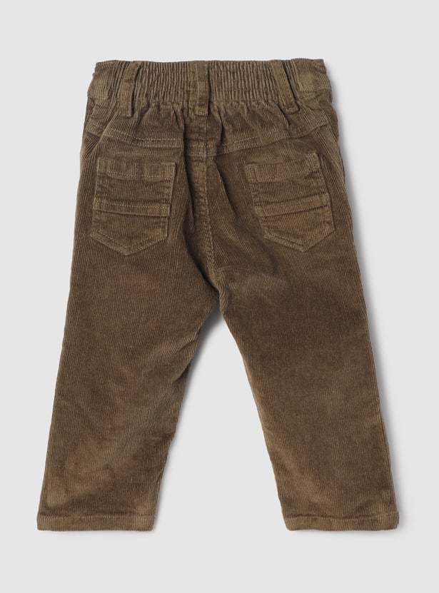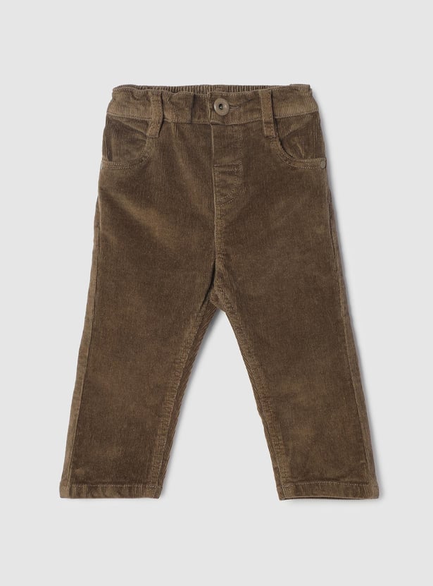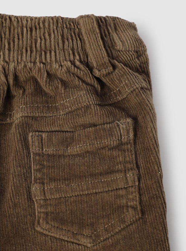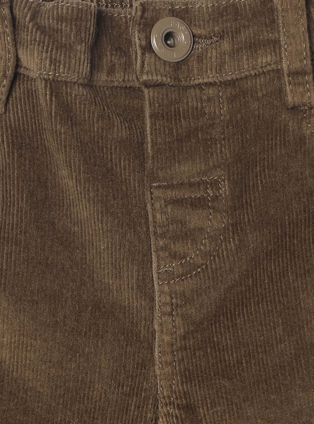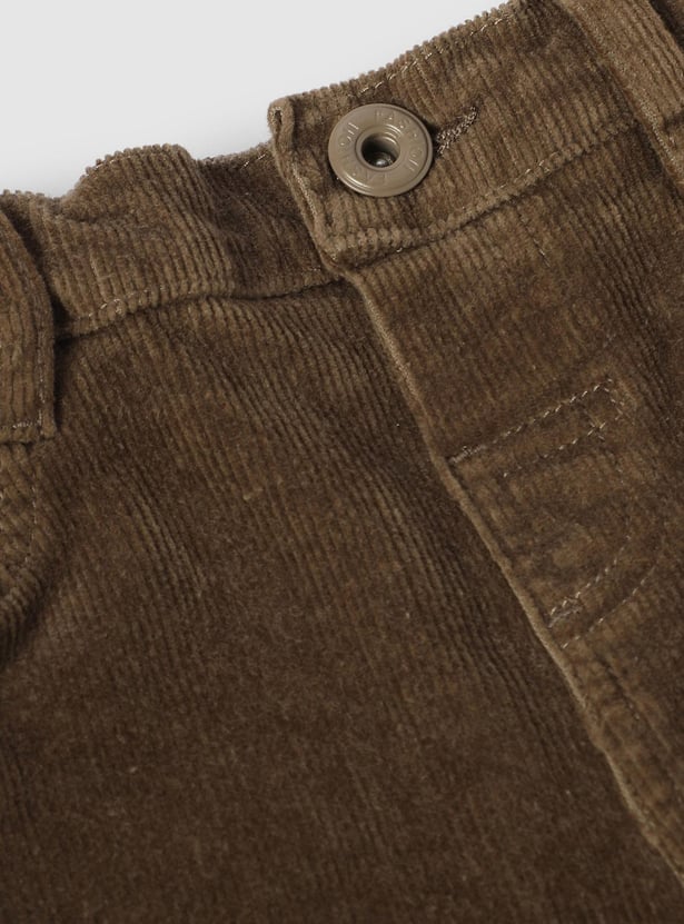 Your child will be stylish on any occasion with these corduroy trousers. They feature a textured surface, handy pockets, a full-length structure, and a button fastening. Pair them with a casual shirt and lace-up shoes for a fashionable look.