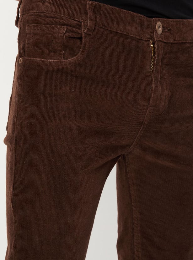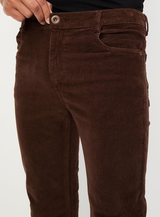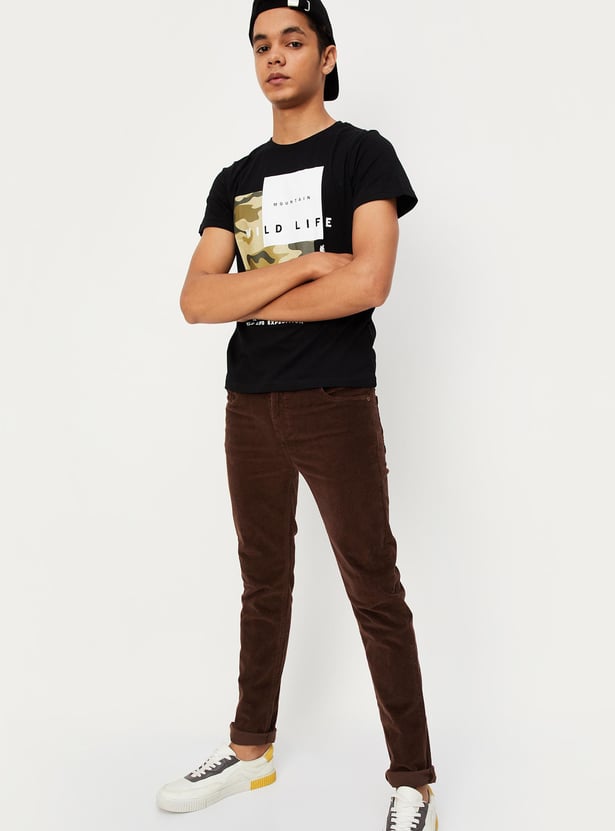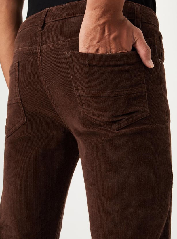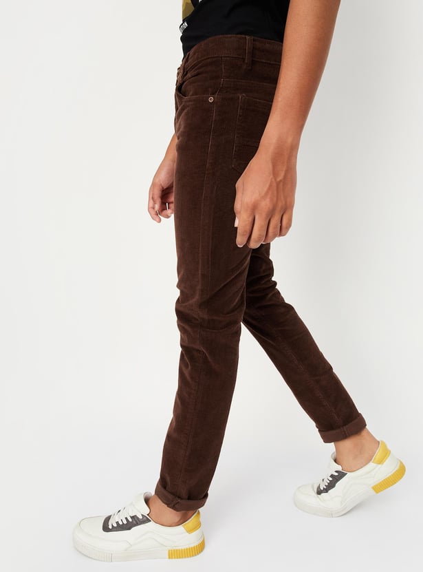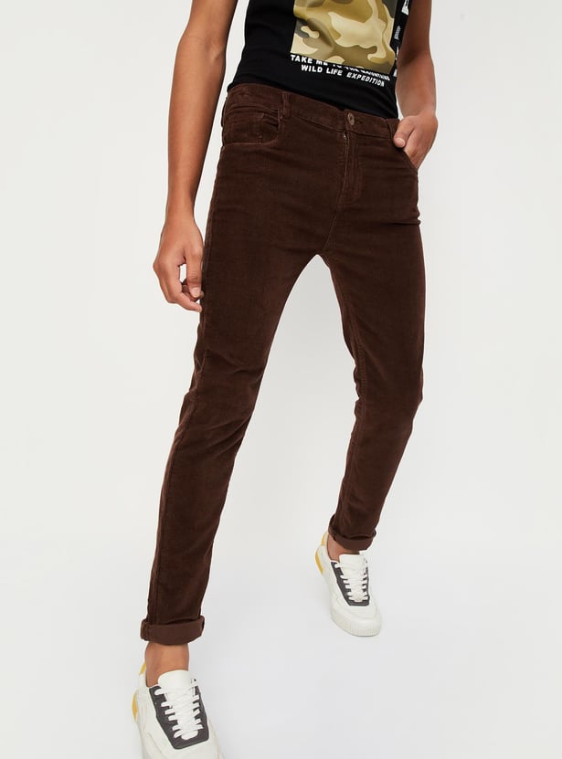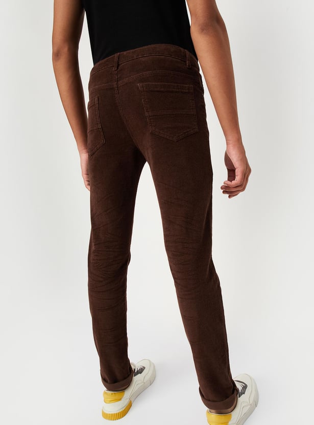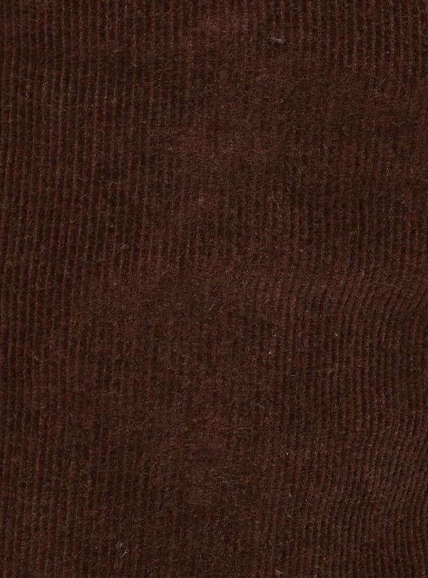 These corduroy trousers will provide your child with a stylish look on any occasion. It has a textured surface, pockets, a full-length structure, and a button fastening. Pair it with a casual shirt and sneakers.