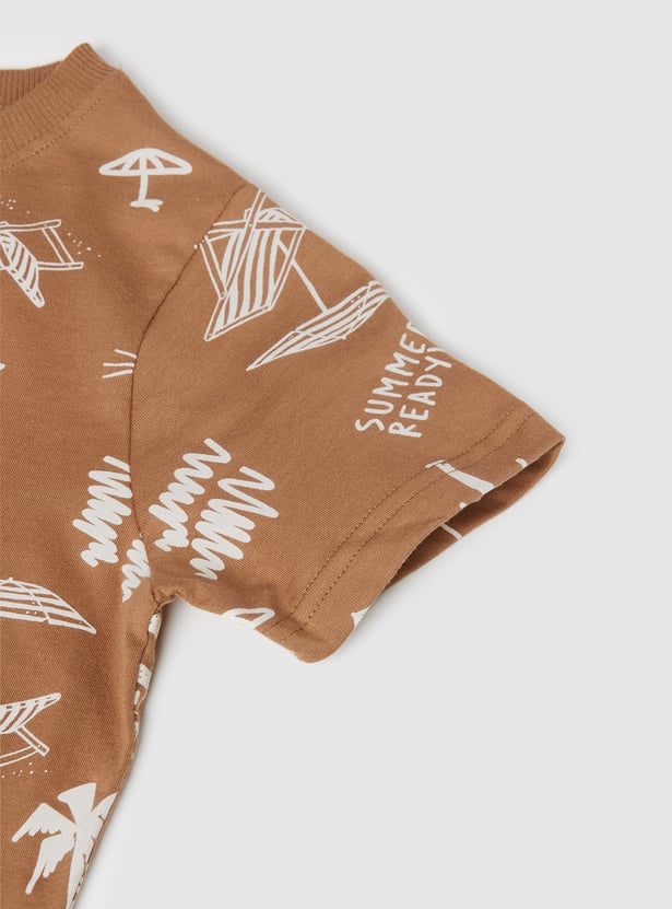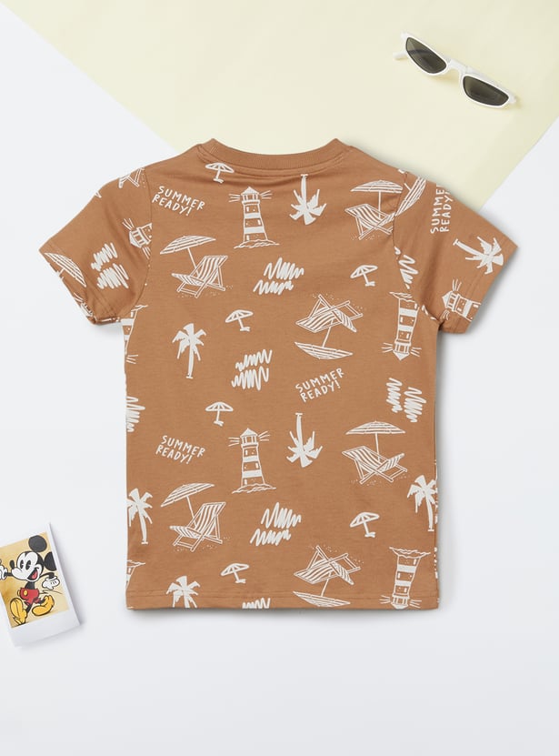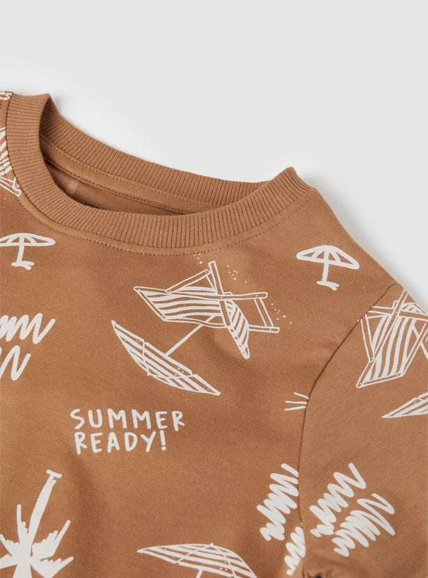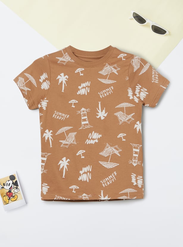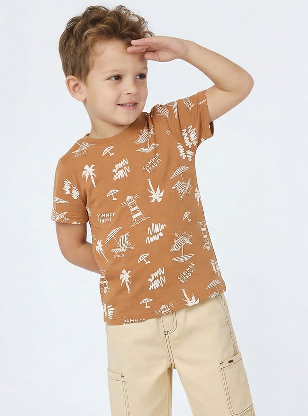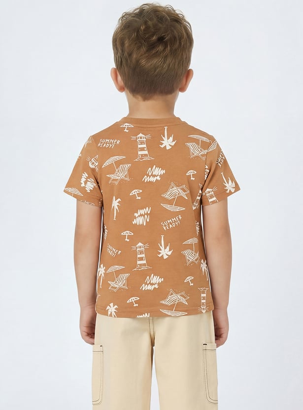 Elevate your boy's casual wardrobe with this stylish printed T-shirt. Featuring a fun summer-ready print with lighthouses, palm trees, and umbrellas, this crew neck, half-sleeve T-shirt offers a playful vibe. Perfect for everyday adventures with a trendy design.