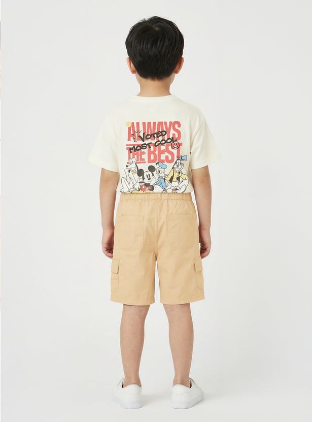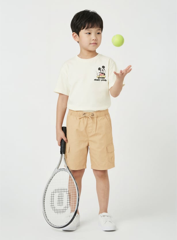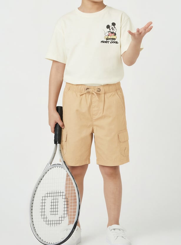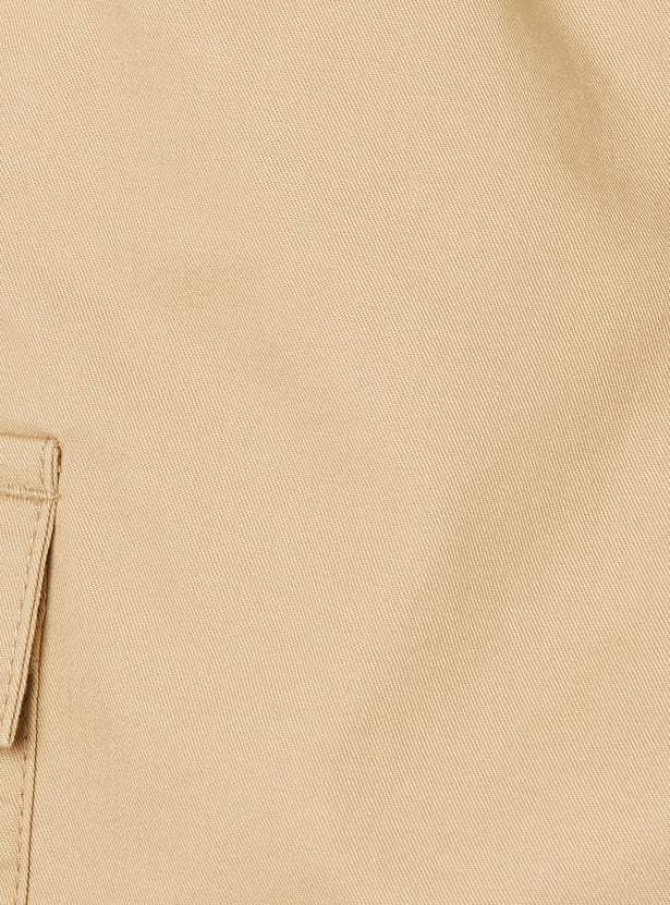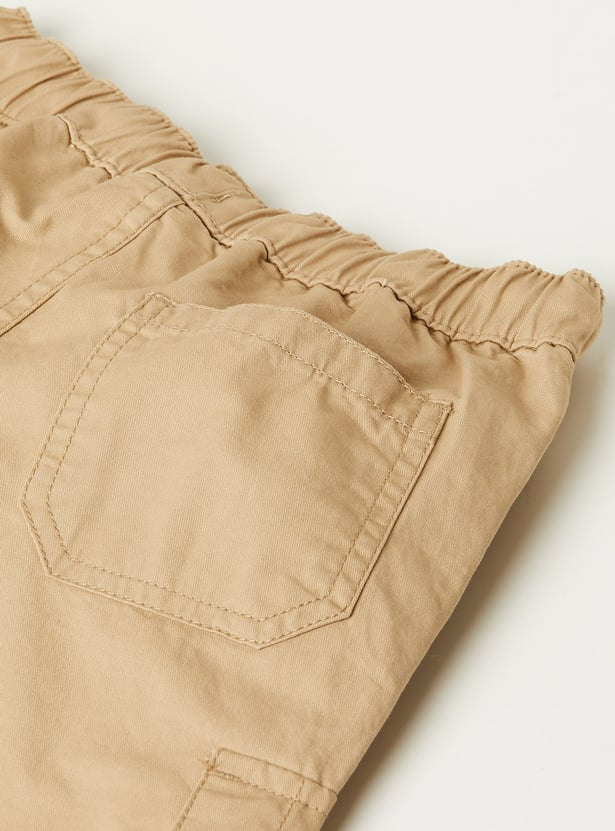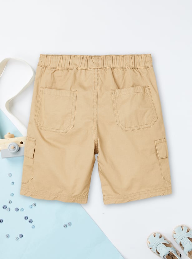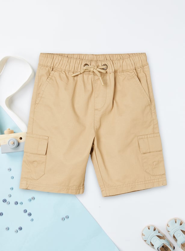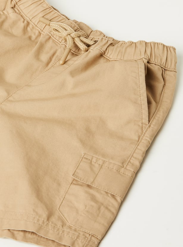 These solid cargo shorts are designed in a relaxed fit with a mid-rise waist for everyday comfort. They feature six functional pockets, an elasticated waistband, and an adjustable drawstring for ease of movement.