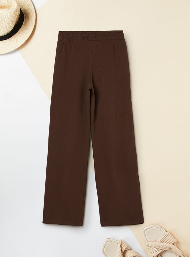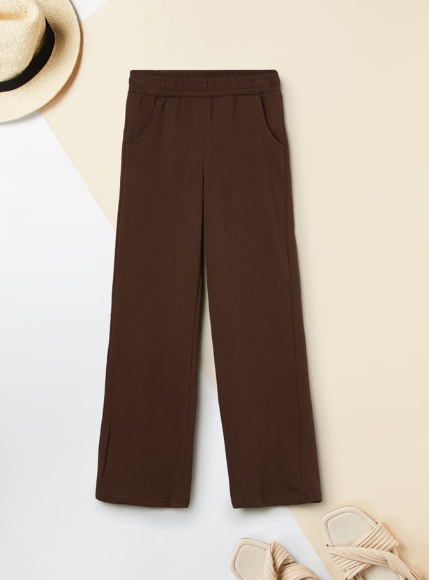 Comfortable and versatile, these solid knit wide leg track pants feature an elasticated waist and practical pockets. The soft knit fabric ensures ease of movement, while the simple design makes them a wardrobe essential for everyday wear.