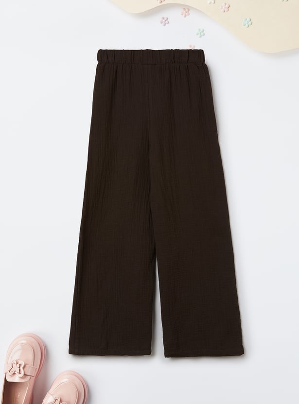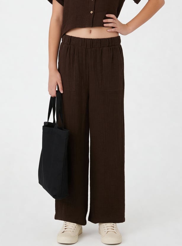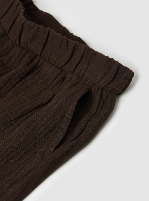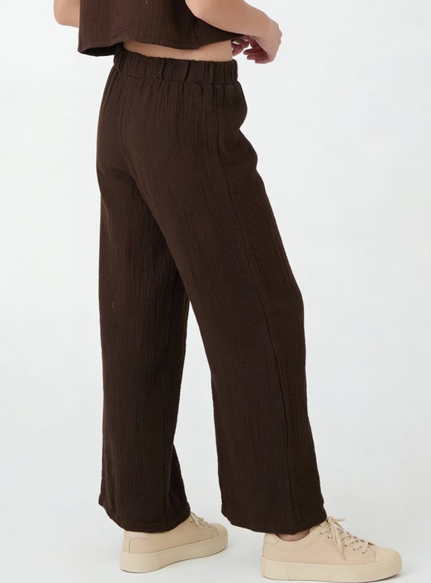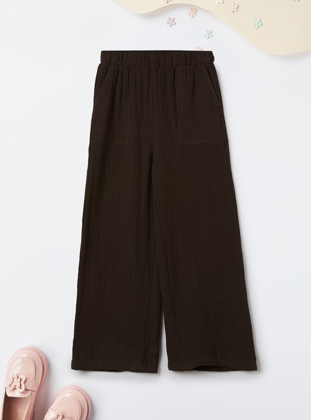 Elevate your everyday style with these textured wide-leg trousers that blend comfort and sophistication. Featuring an elasticated waist for a flexible fit and practical pockets, they offer effortless movement with a chic silhouette.