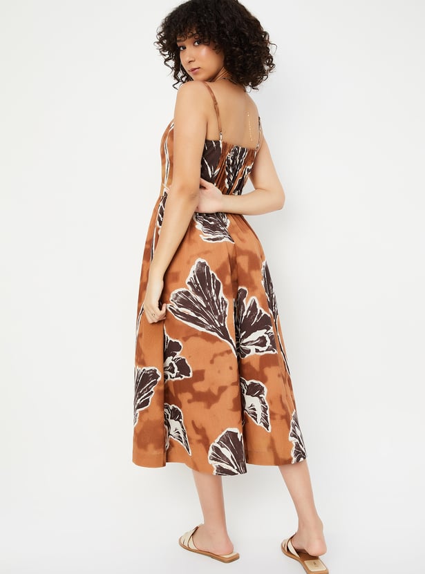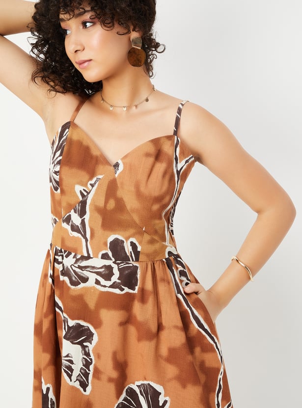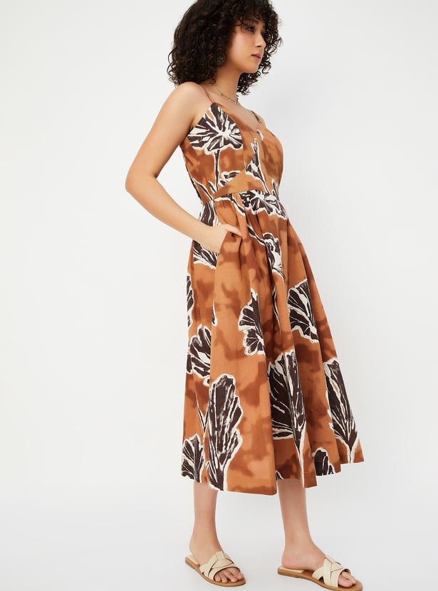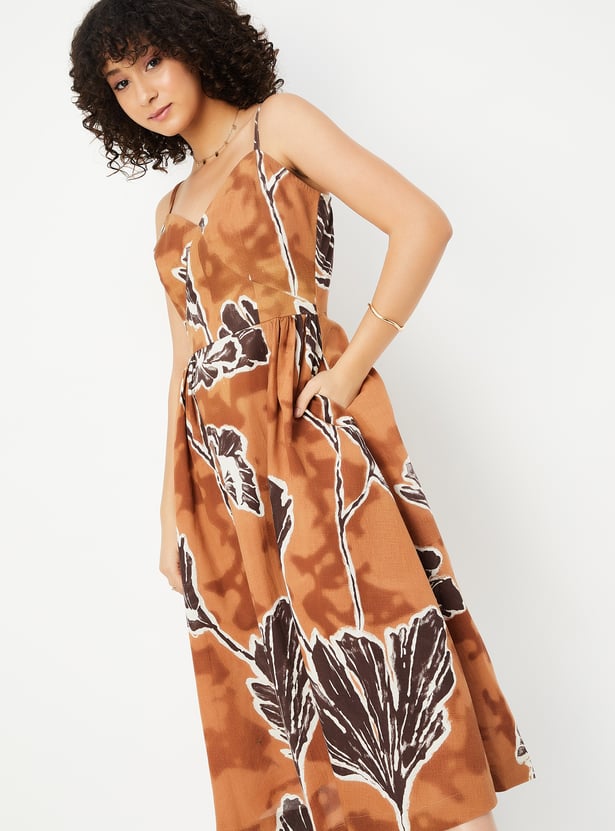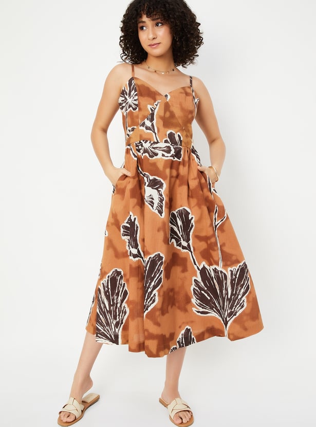 This printed A-line dress features a flattering sweetheart neckline, spaghetti straps, and a midi length for a feminine, breezy look. The side pockets add a practical yet stylish touch to the dress.