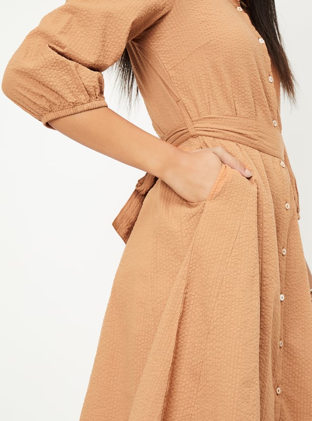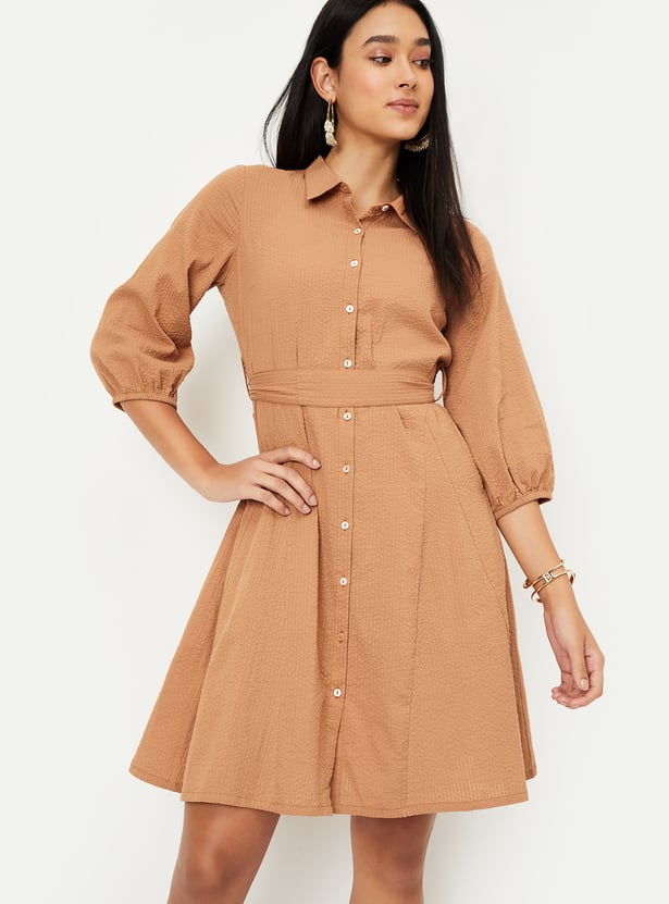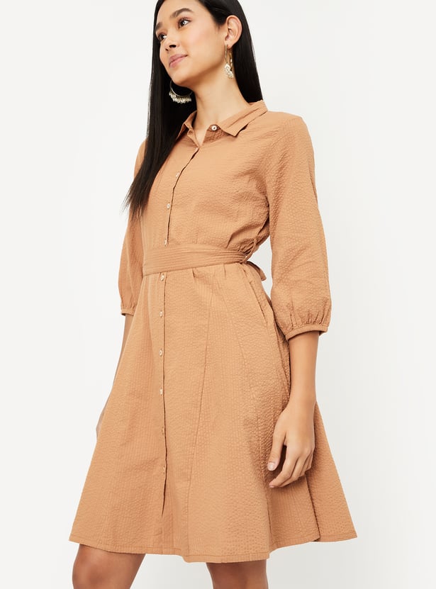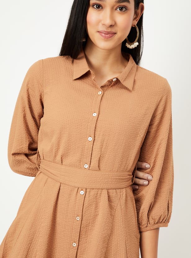 Embrace timeless style with this seersucker belted shirt dress. Featuring a button placket, spread collar, and a flattering belted waist, it offers a perfect balance of classic design and modern charm. The 3/4th sleeves make it ideal for year-round wear.