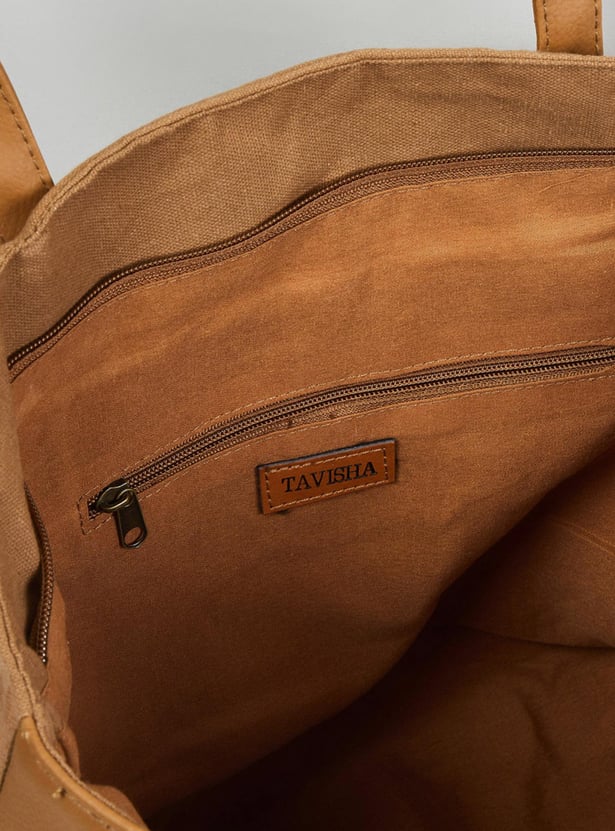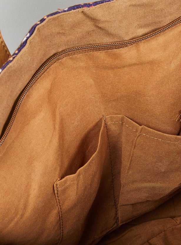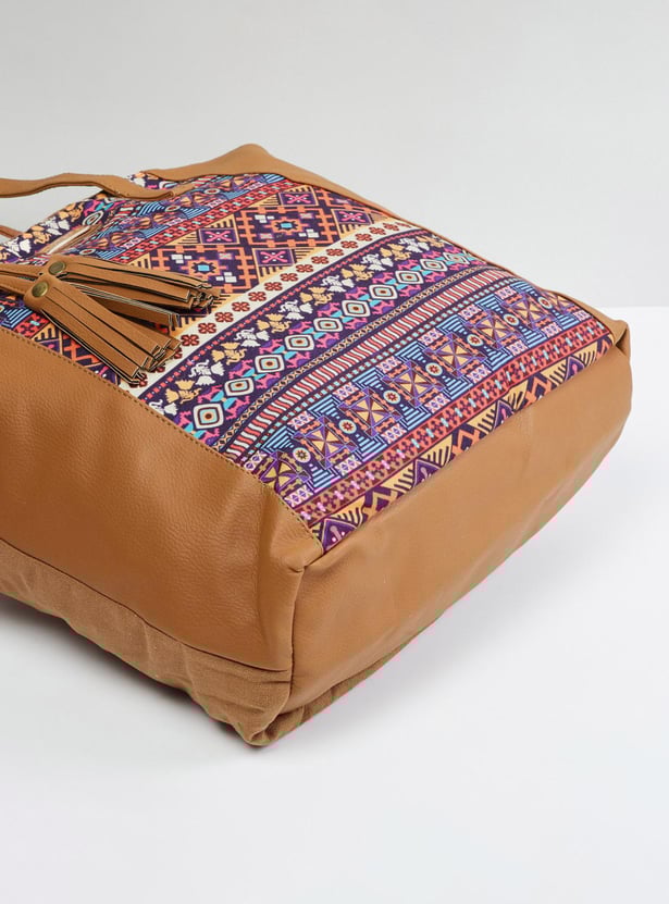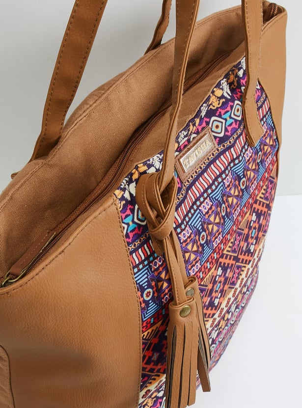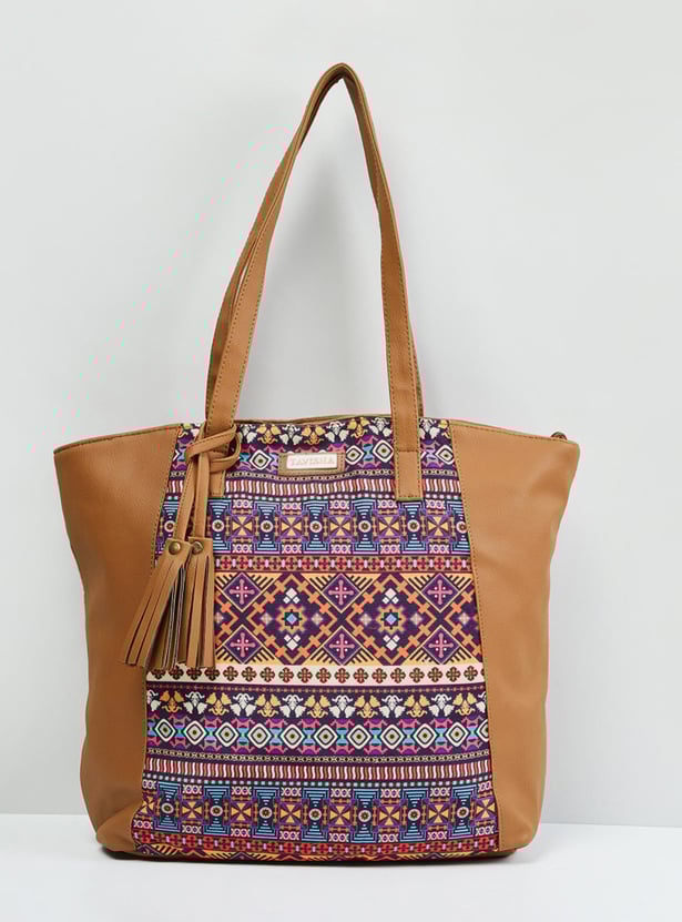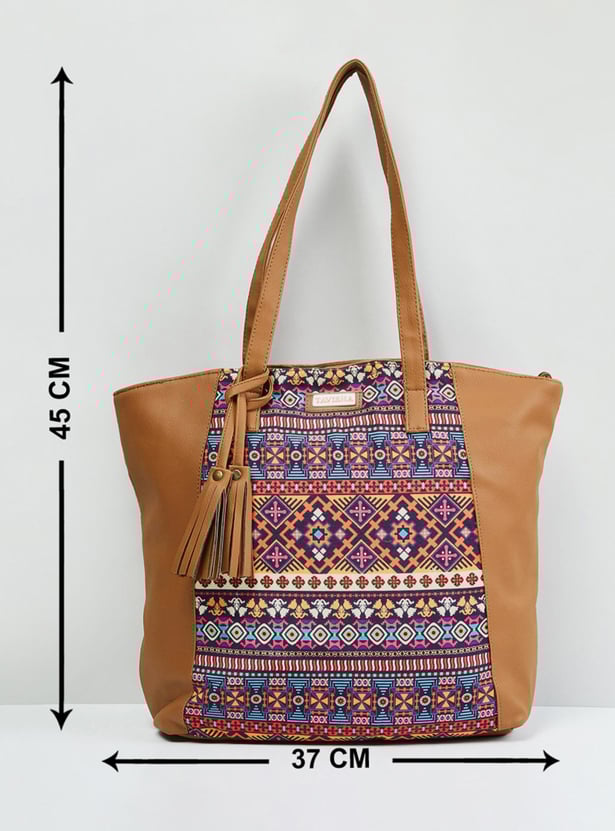 This high-end tote bag is detailed with a printed surface with zip closure, spacious compartment, 1 external pocket, and multiple inner pockets.