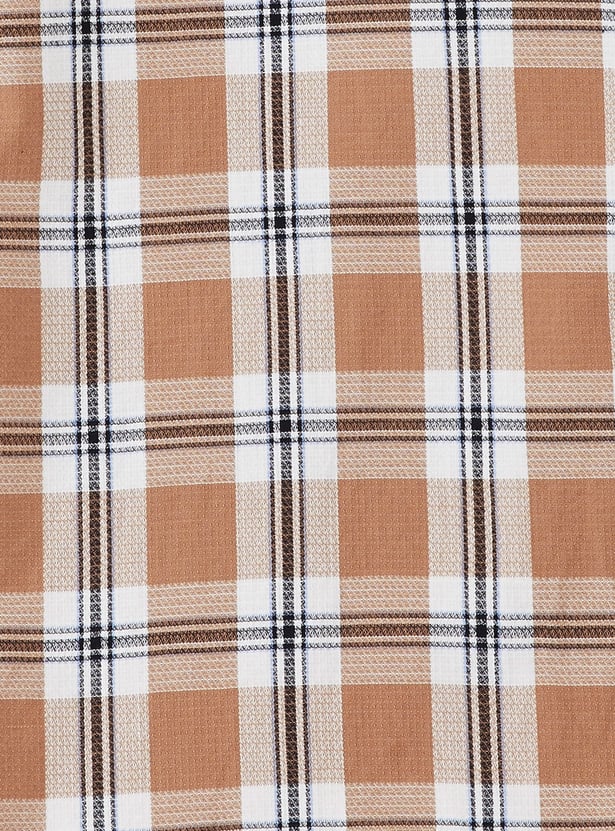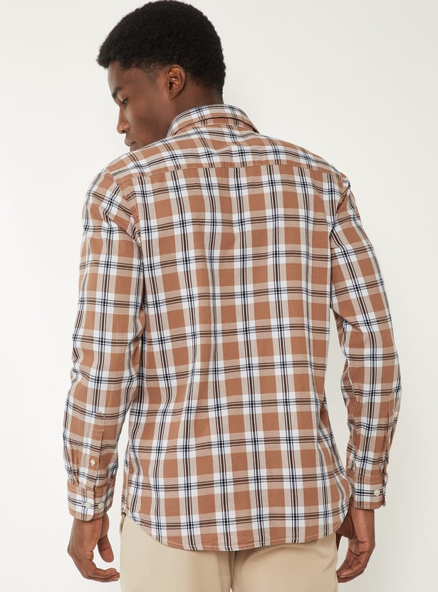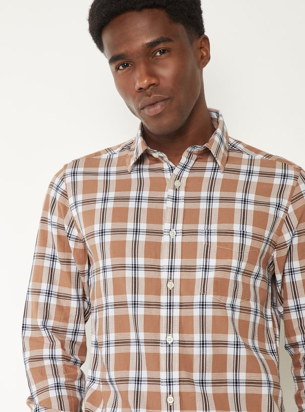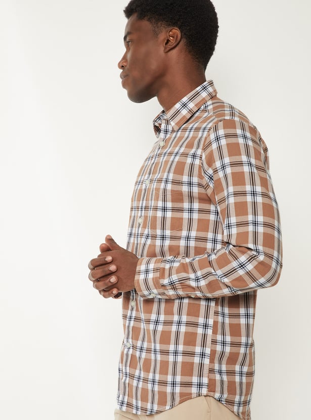 Keep it sharp and versatile with this checked slim-fit shirt. Designed with a spread collar, button placket, and full sleeves with button cuffs, it offers a tailored silhouette that’s both polished and comfortable. The patch pocket adds a practical touch while maintaining the clean, structured look.