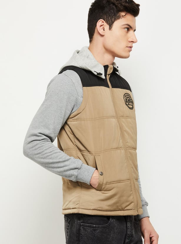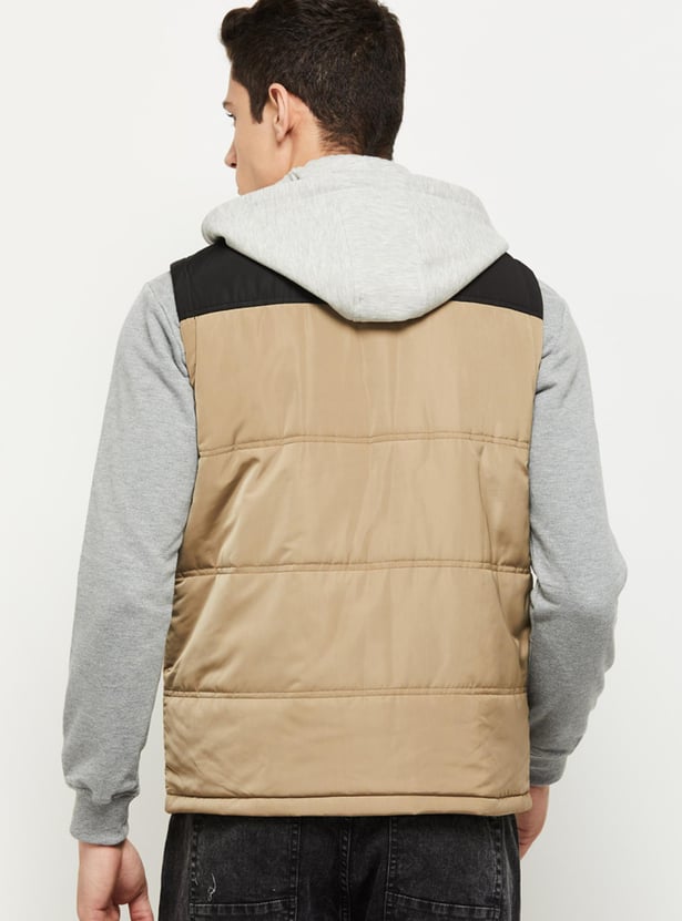 Move in style with this puffer jacket designed and detailed with colorblocked design, zip closure, pockets, hooded neckline, and sleeveless sleeves, for your functional and fashion perfect fit. For a classic striking look, style it up with casual trousers and a full sleeves t-shirt.
