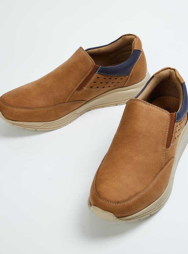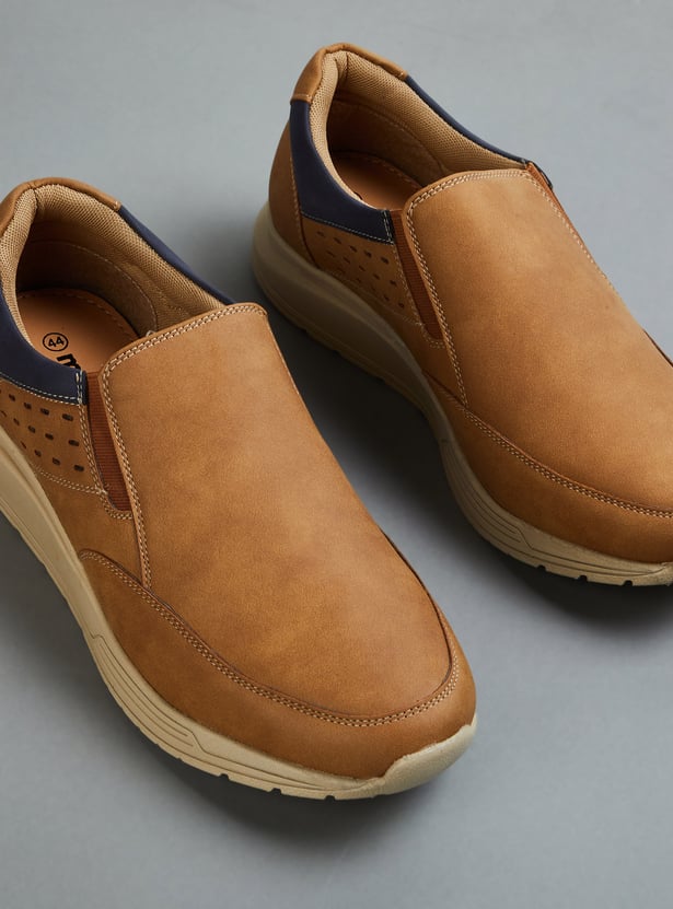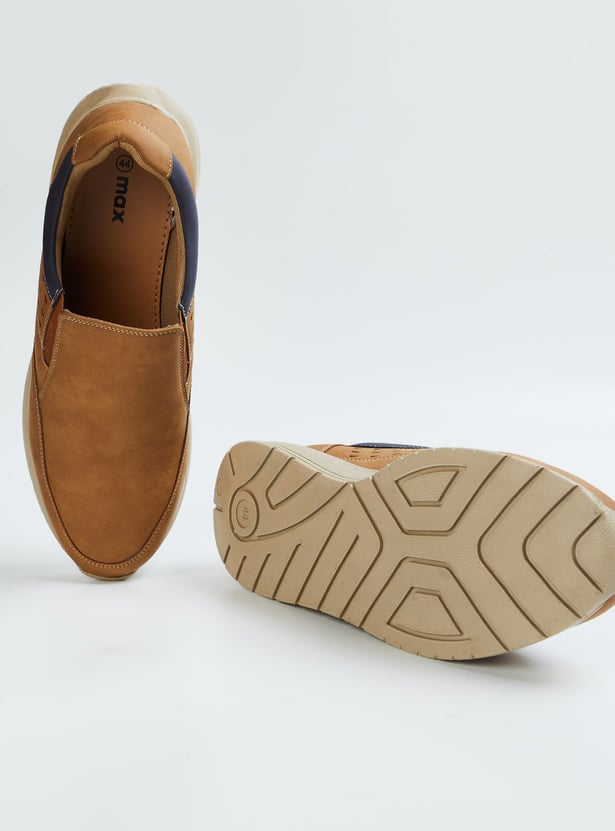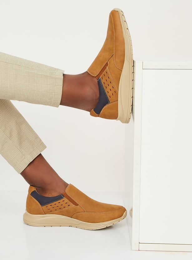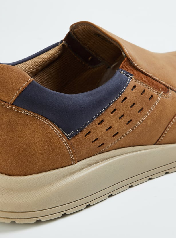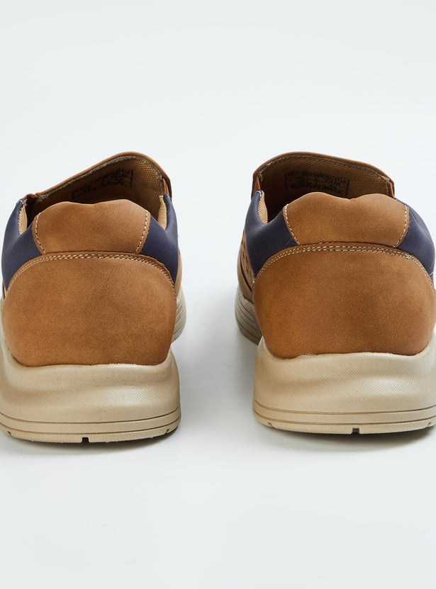Smarten your casual style with this pair of moccasins. It features a colourblock upper, moc toe design, elastic inserts on the sides, cut-out on the sides, cushioned insole, and long-lasting outsole.